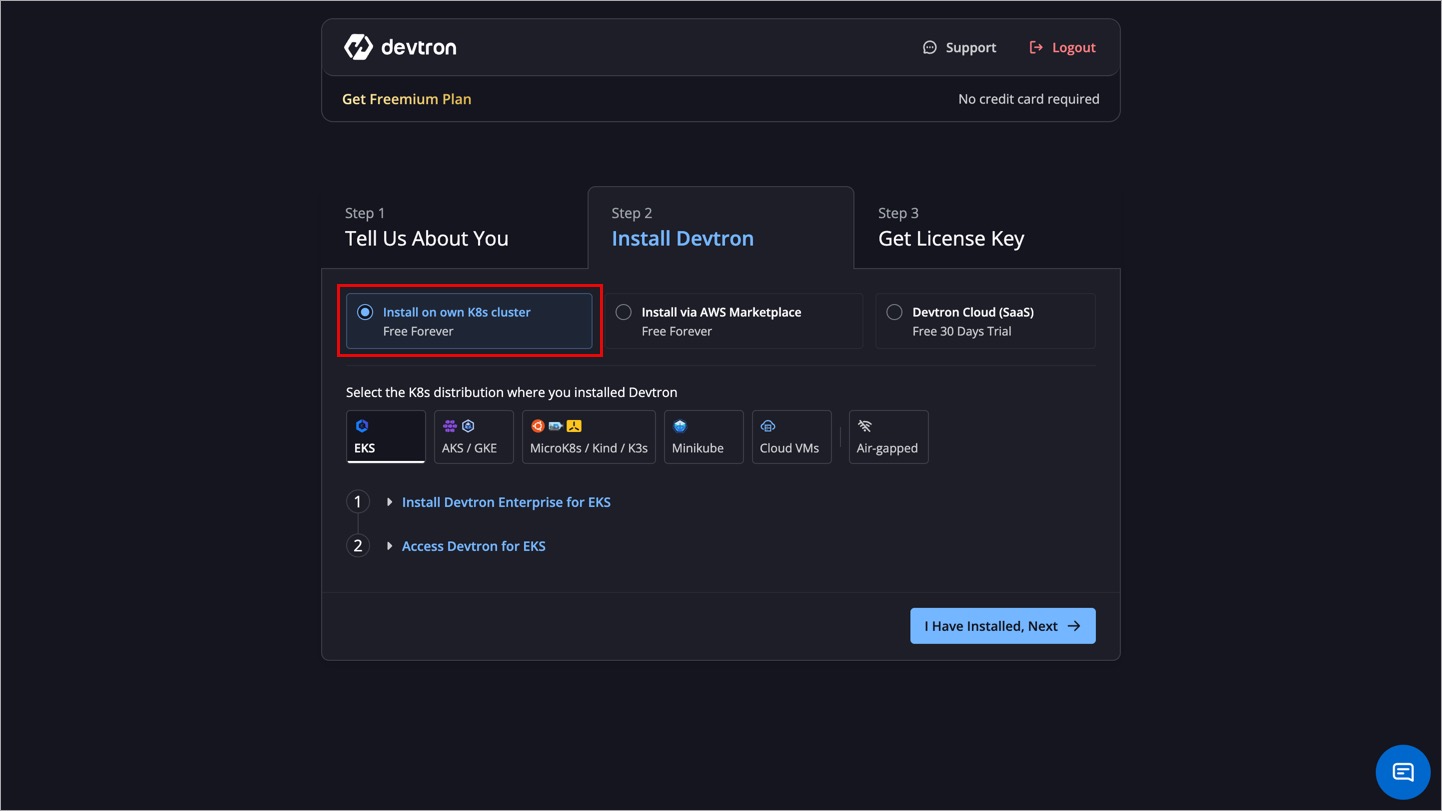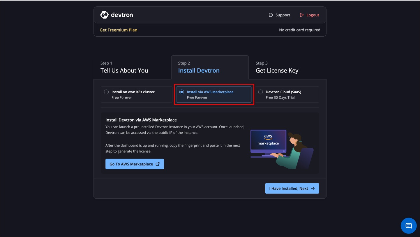 To install Devtron Freemium, go to Devtron's License Dashboard.