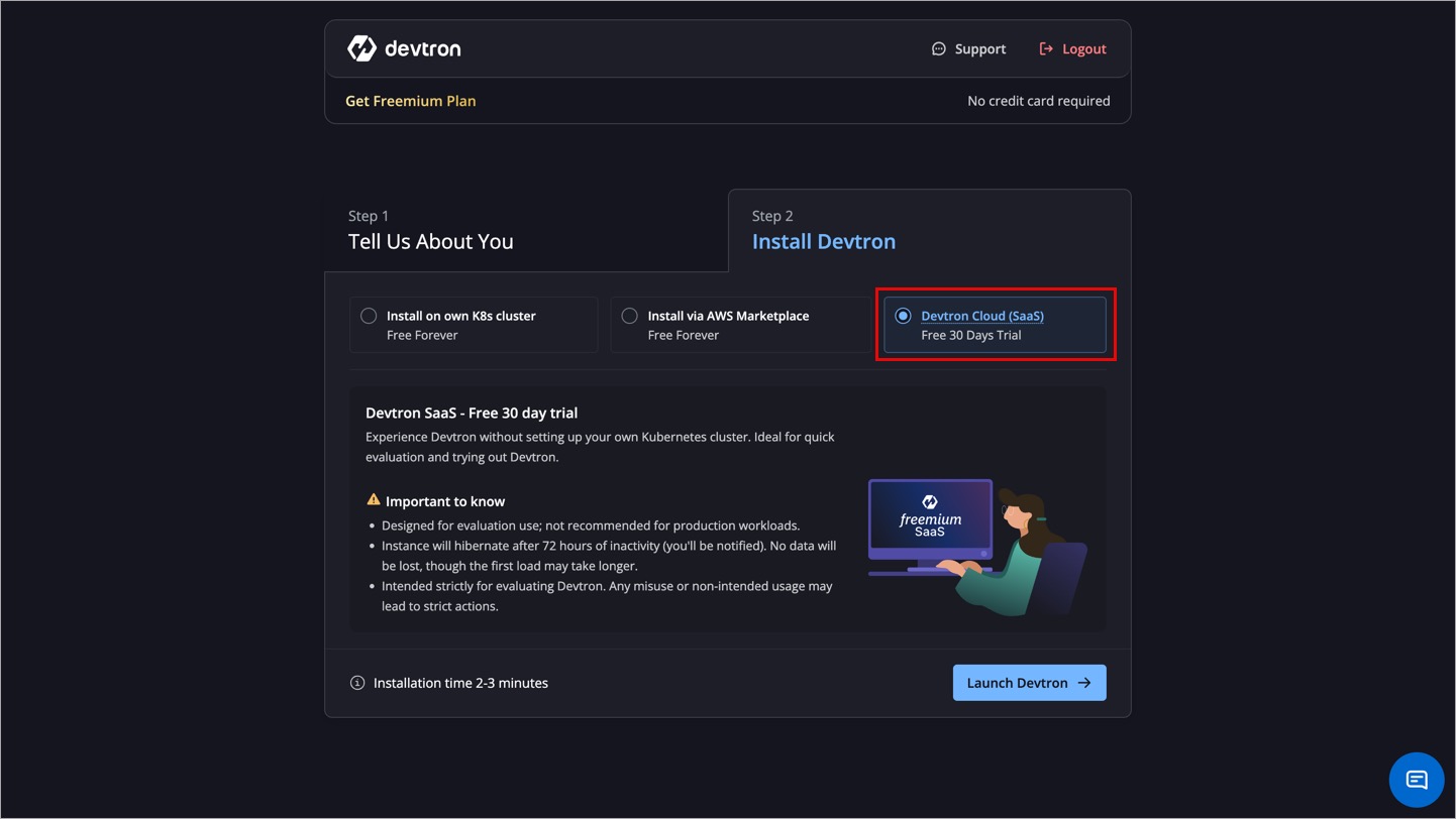 Figure 9: Choosing 'Devtron Cloud (SaaS)'