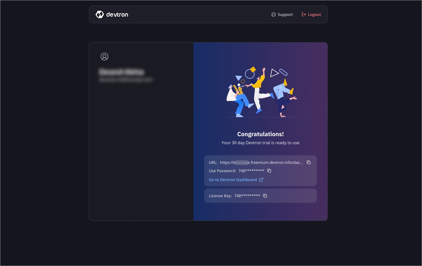 2. Devtron Freemium will be activated, and you can log in to Devtron Dashboard.