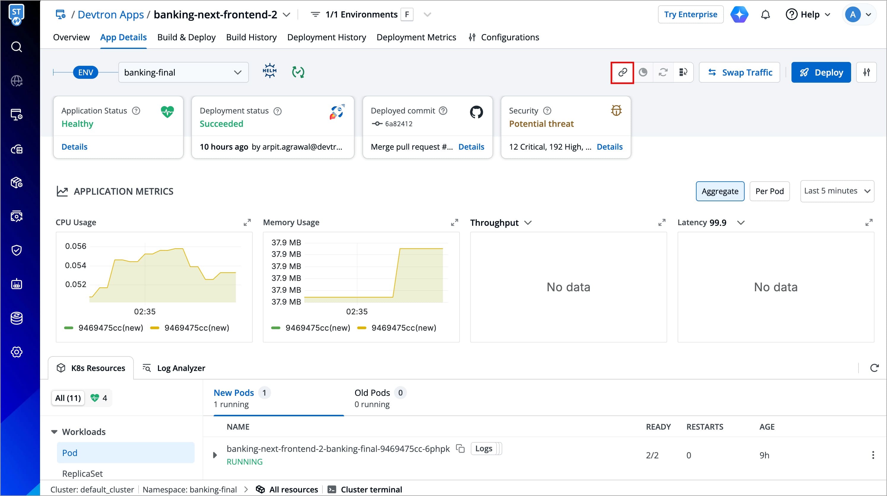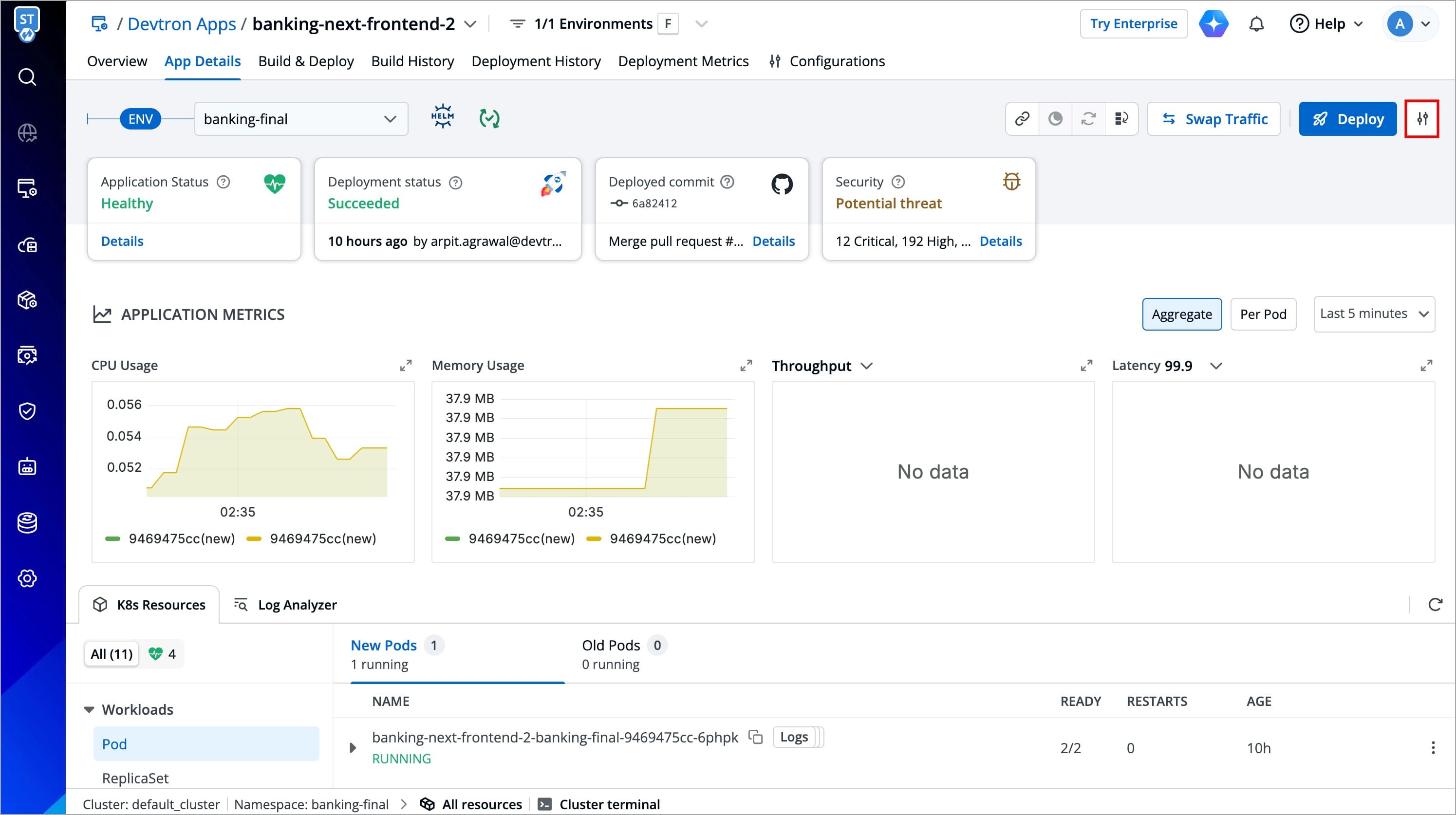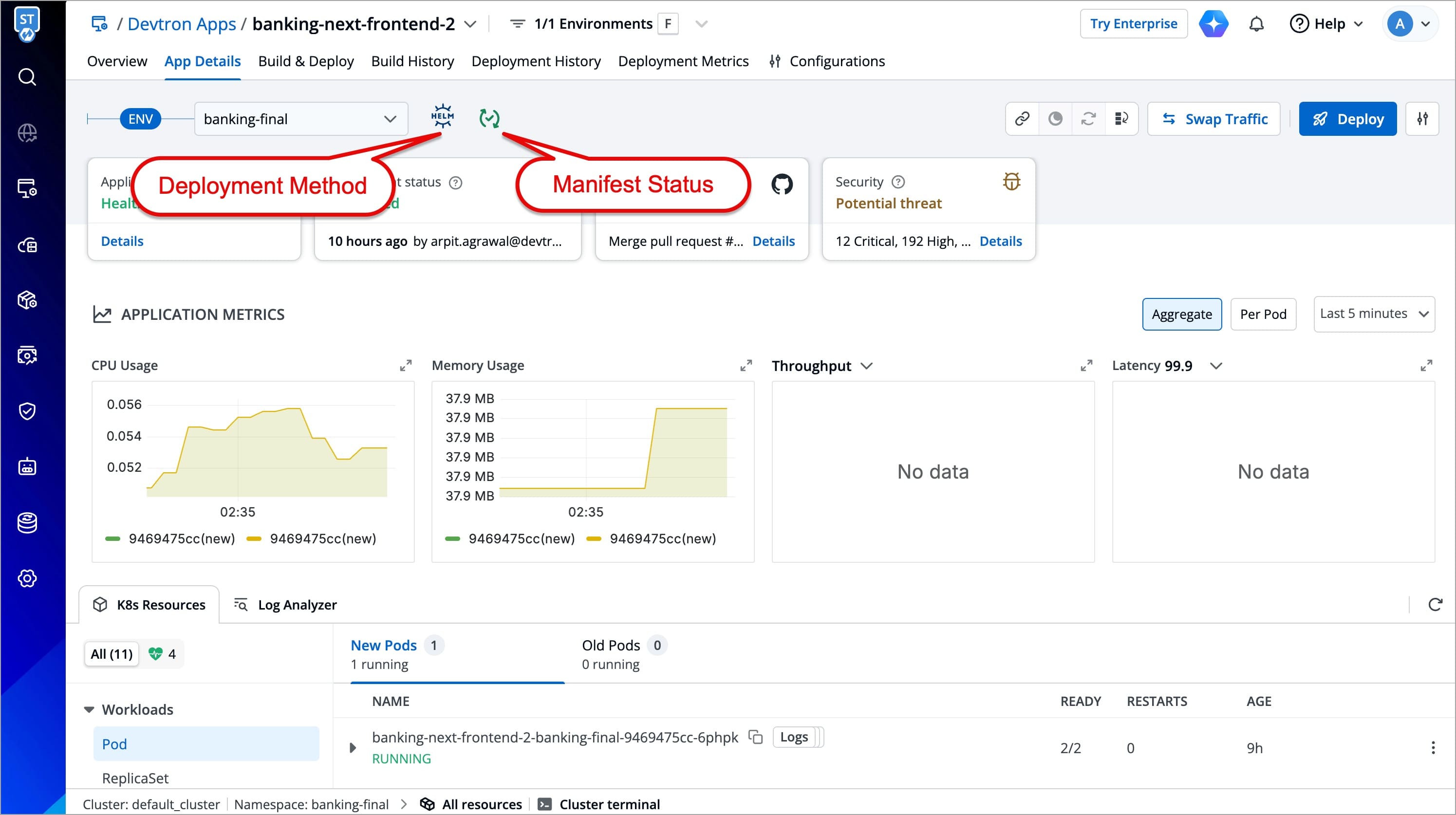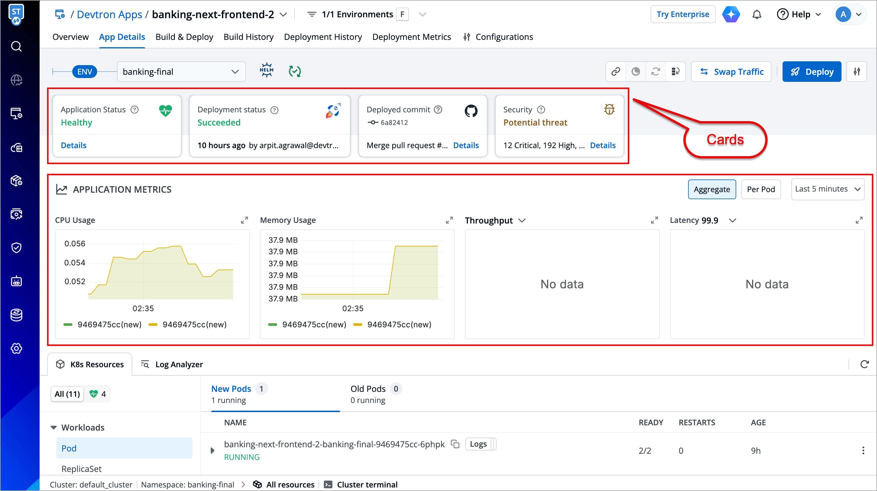 Devtron helps you to view your application summary in the form of cards and Application Metrics. It also helps you perform quick actions and manage the most widely used Kubernetes resources directly from the App Details page.