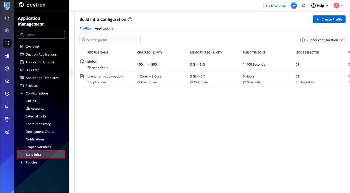 From the left sidebar, go to Application Management → Configurations → Build Infra.