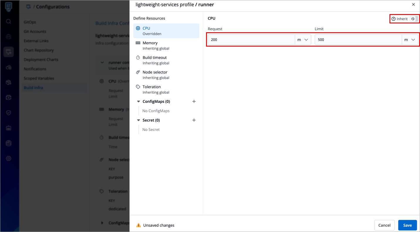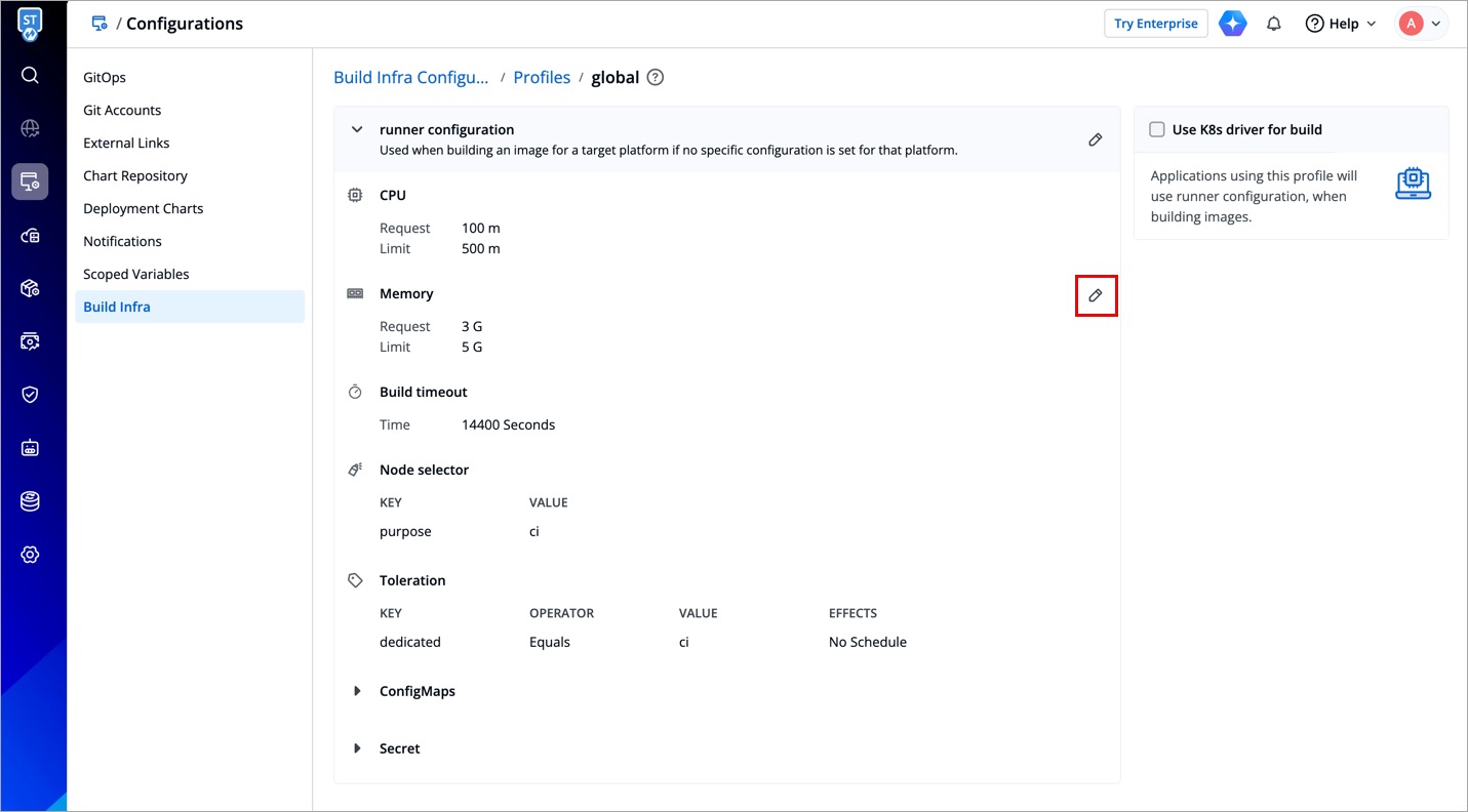 Each platform may have unique requirements for resources like CPU and memory, or they may benefit from different configuration of resources. Thus, Devtron allows defining platform specific configurations within a build infra profile. This ensures each build is executed with the right configurations specific to the target platform.