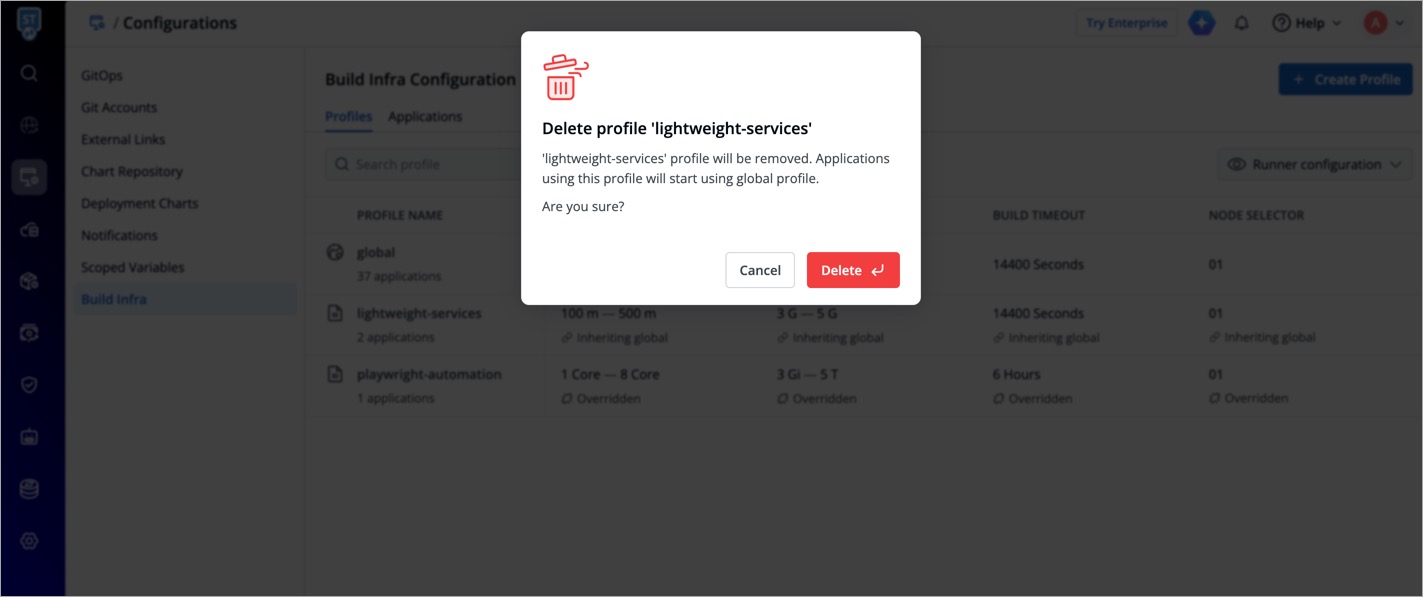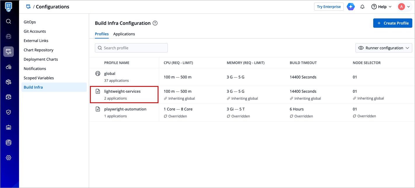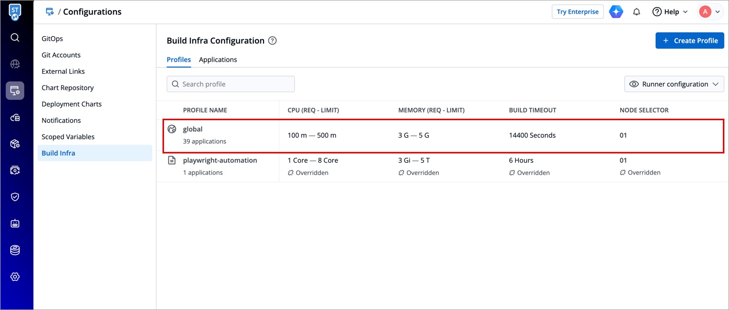 Under Profiles tab, you will see the Global Profile and a list of Custom Profiles (if they exist). Setting up profiles makes it easier for you to manage the build infra configurations, ensuring its reusability in the long term.