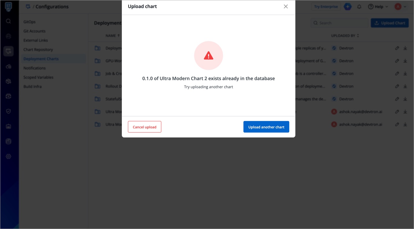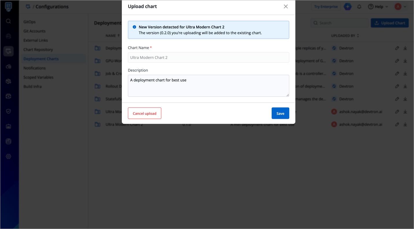 Only super admin users can upload a deployment chart. A super admin can upload multiple versions of a chart.
