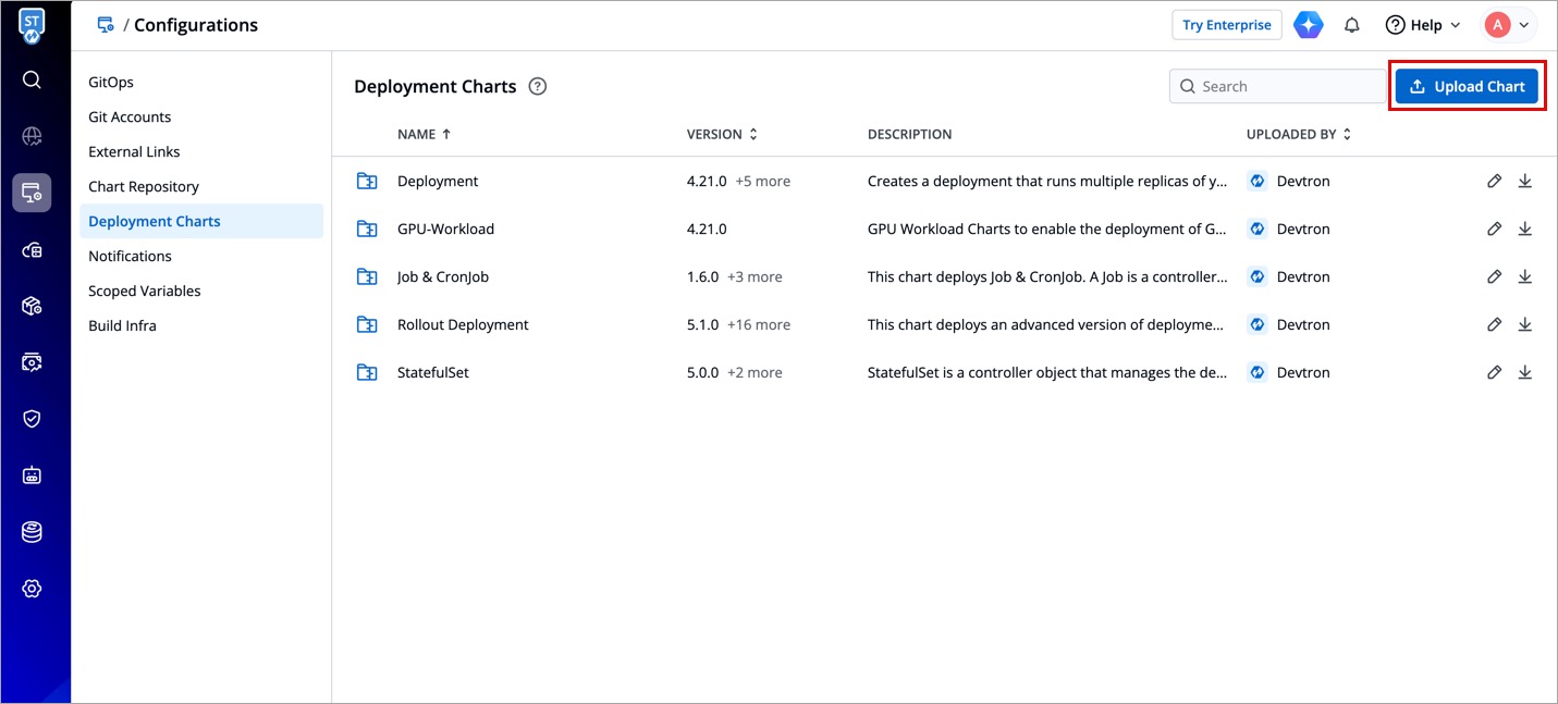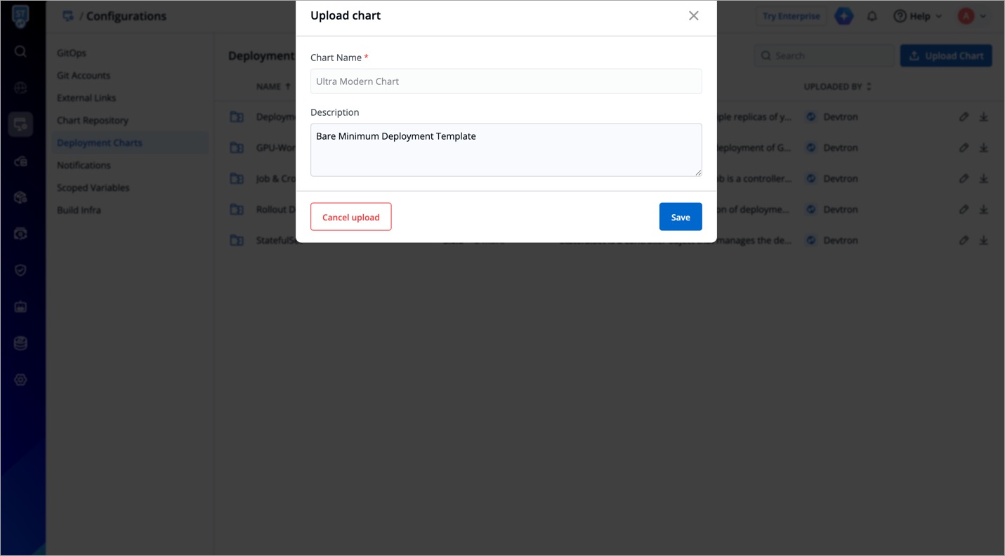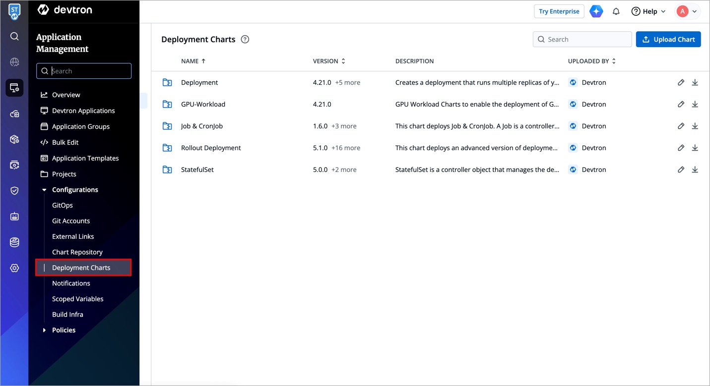 Once you successfully upload a deployment chart, you can start using it as a deployment template for your application. Refer Deployment Template to know more.