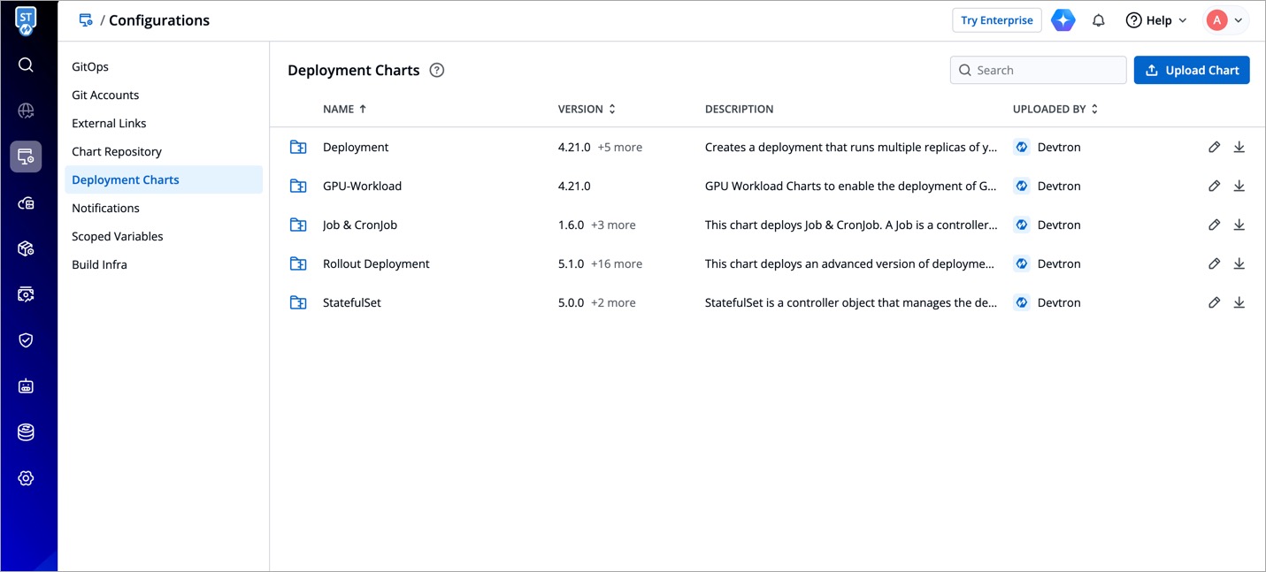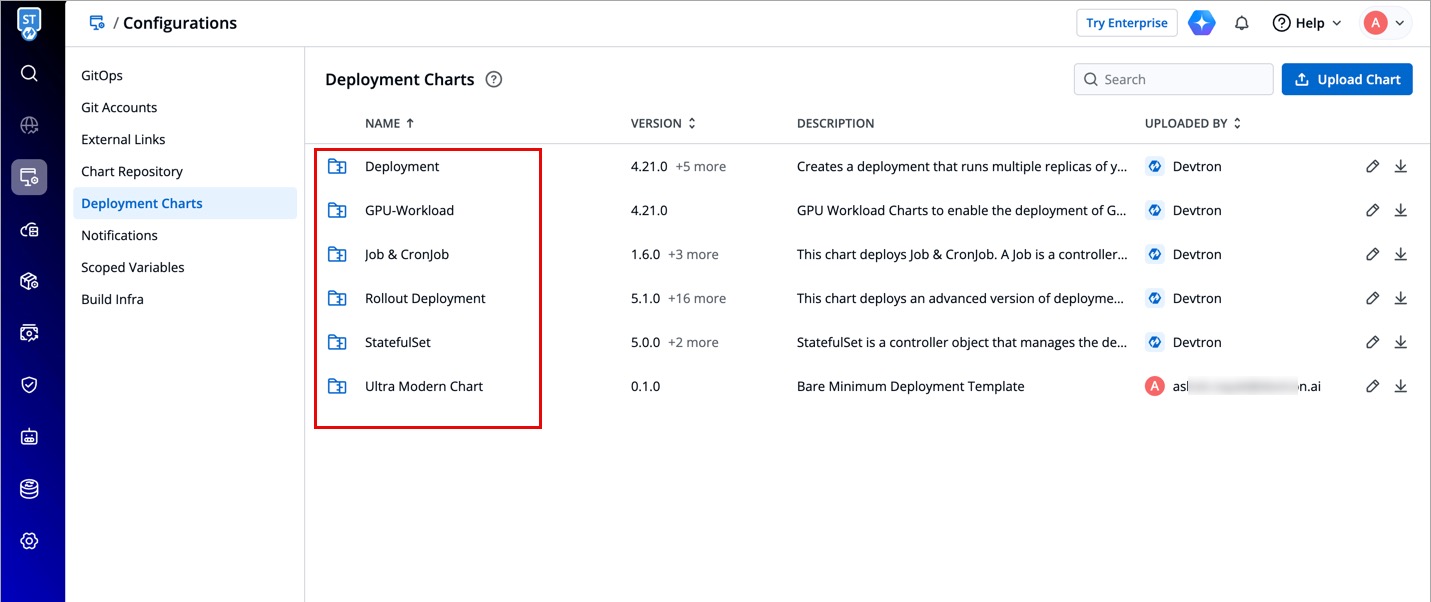 To view the list of available deployment charts, go to Application Management β Configurations β Deployment Charts page.