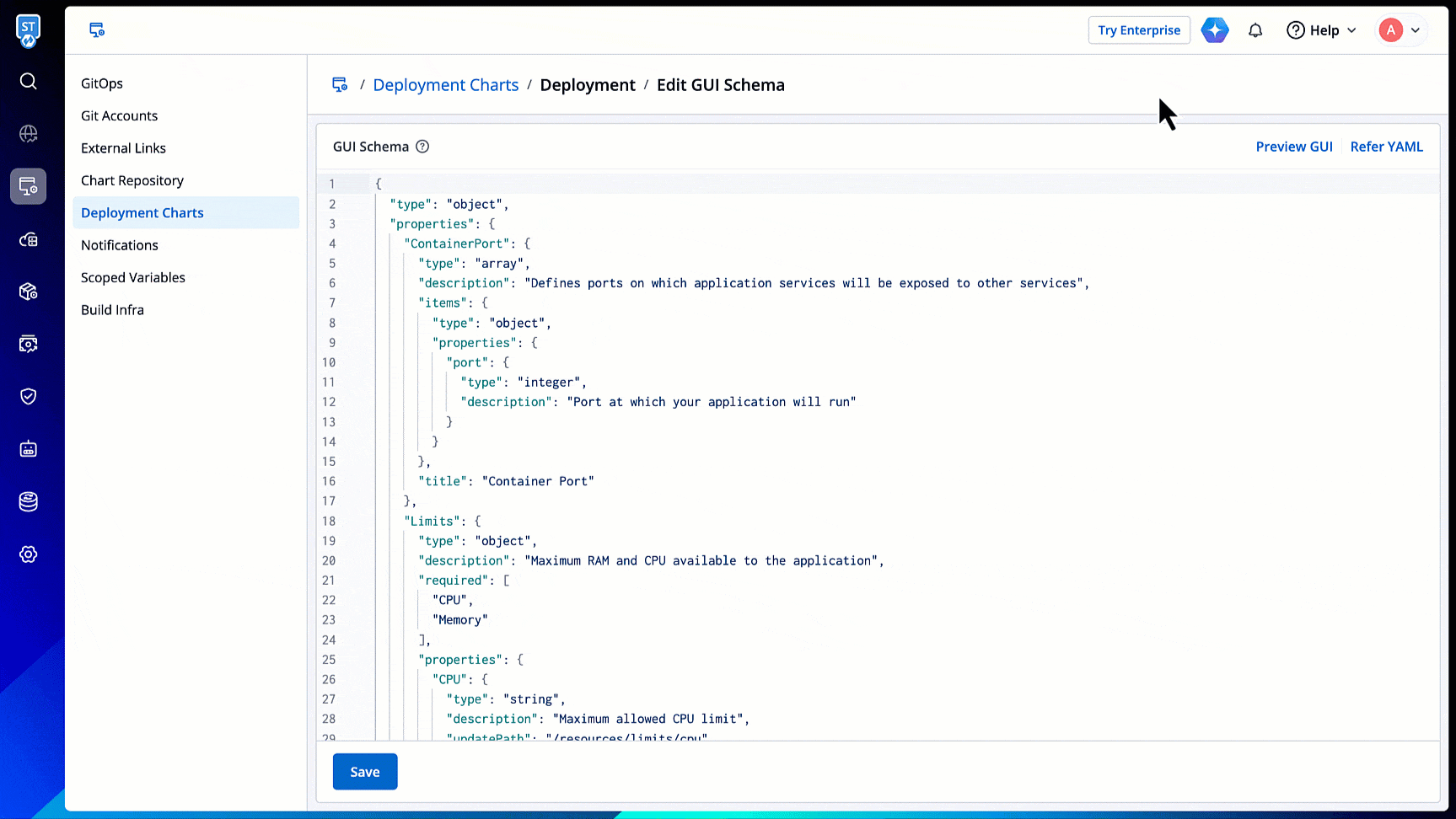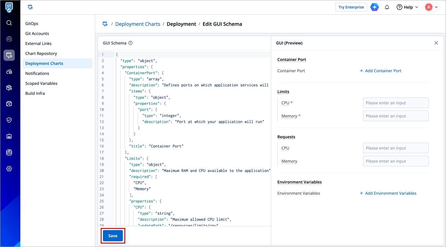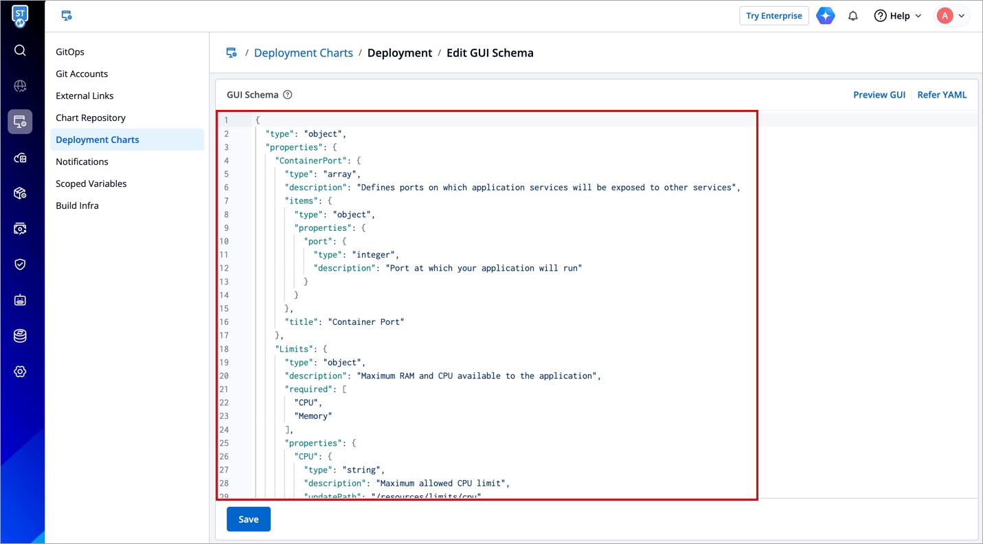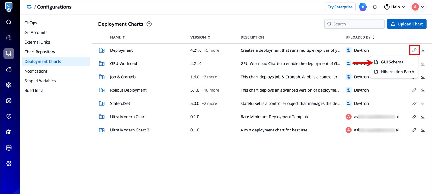 A GUI schema is available for you to edit in case of Devtron charts. In case of custom charts, you may have to define a GUI schema yourself. To know how to create such GUI schema, refer RJSF JSON Schema Tool.