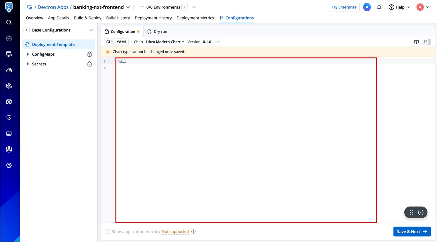 However, if you upload the chart without an app-values.yaml or with an empty one, your deployment template will appear blank (as shown below) or null.