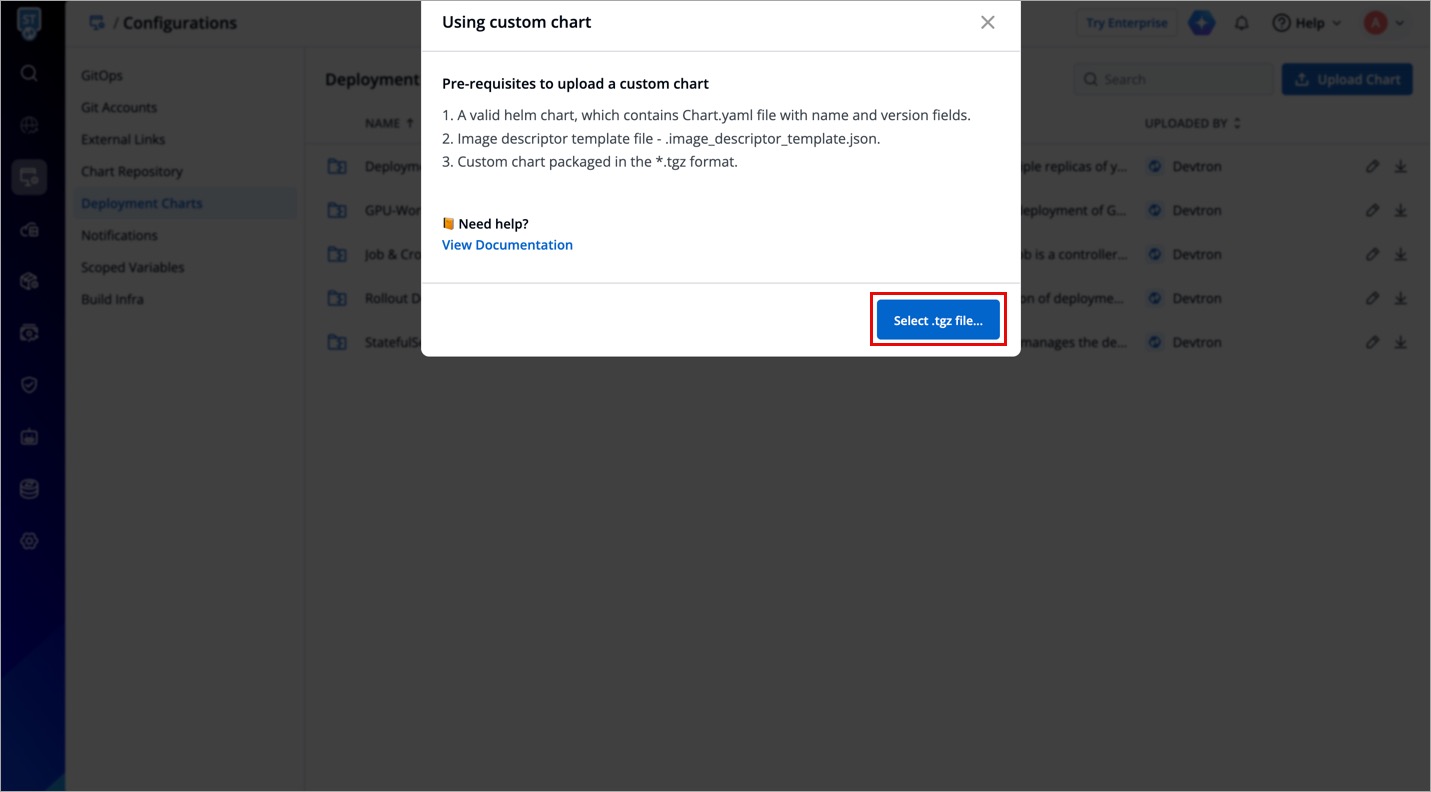 Click Select .tgz file and upload your packaged deployment chart (in .tgz format).