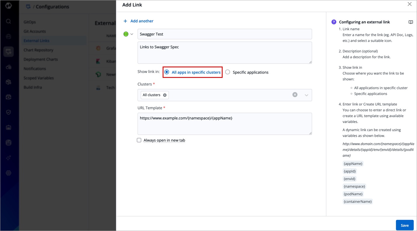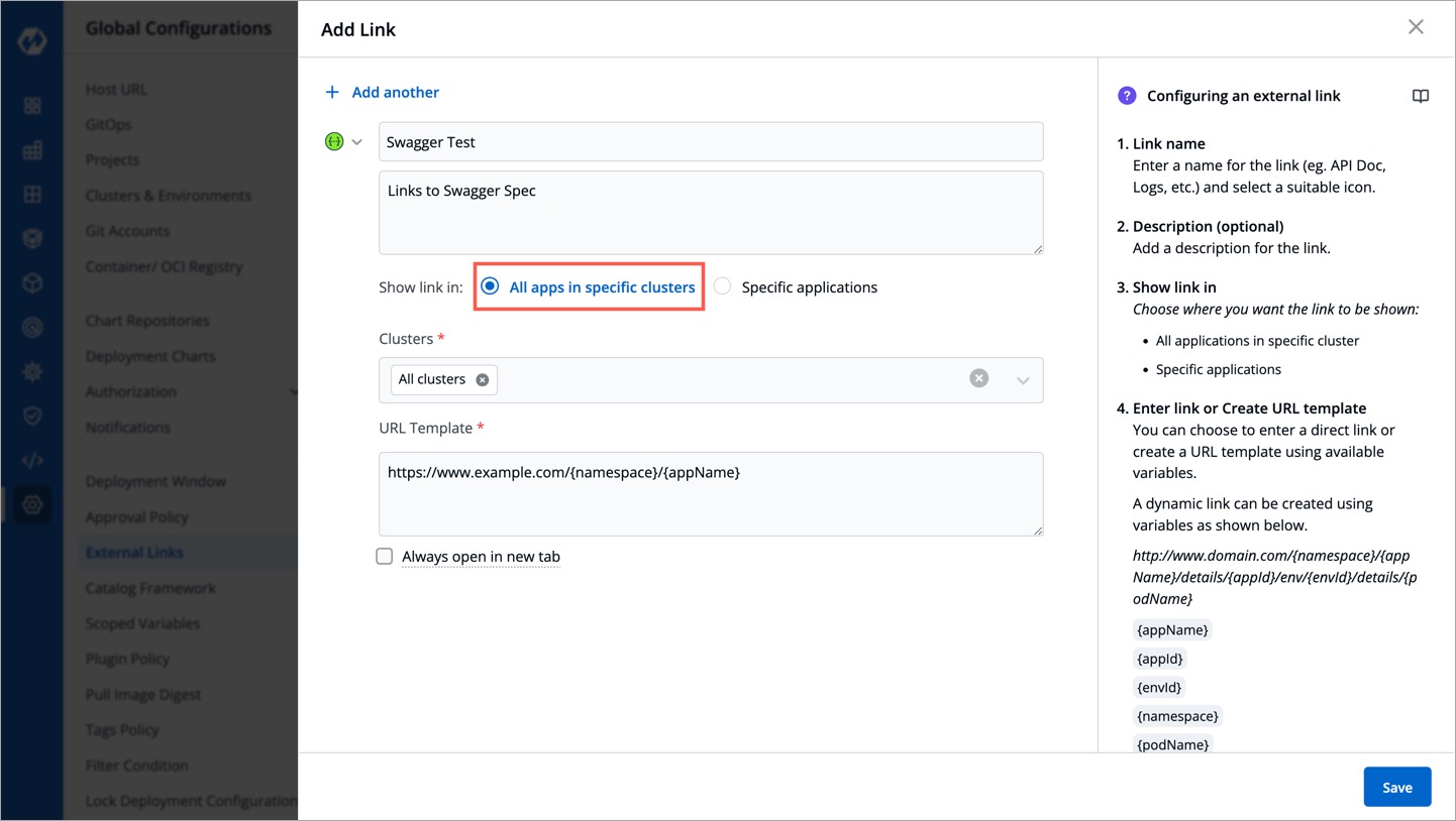 | Clusters | Choose the clusters for which you want to configure the selected external link with. - Select one or more than one cluster to enable the link on the specified clusters. - Select All Clusters to enable the link on all the clusters. |