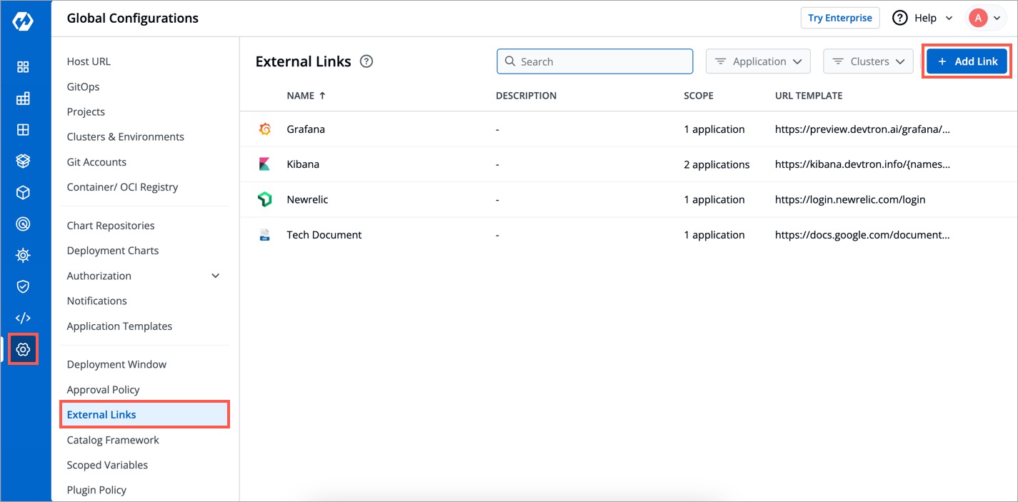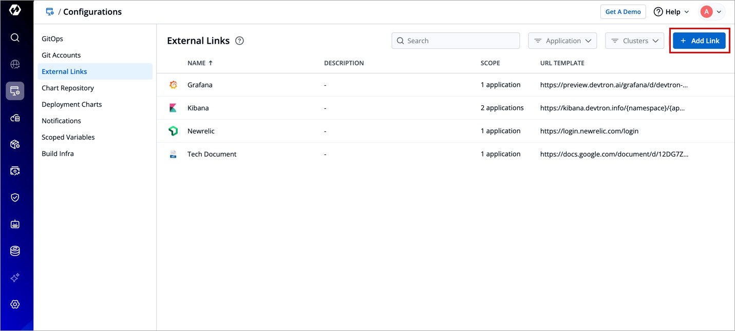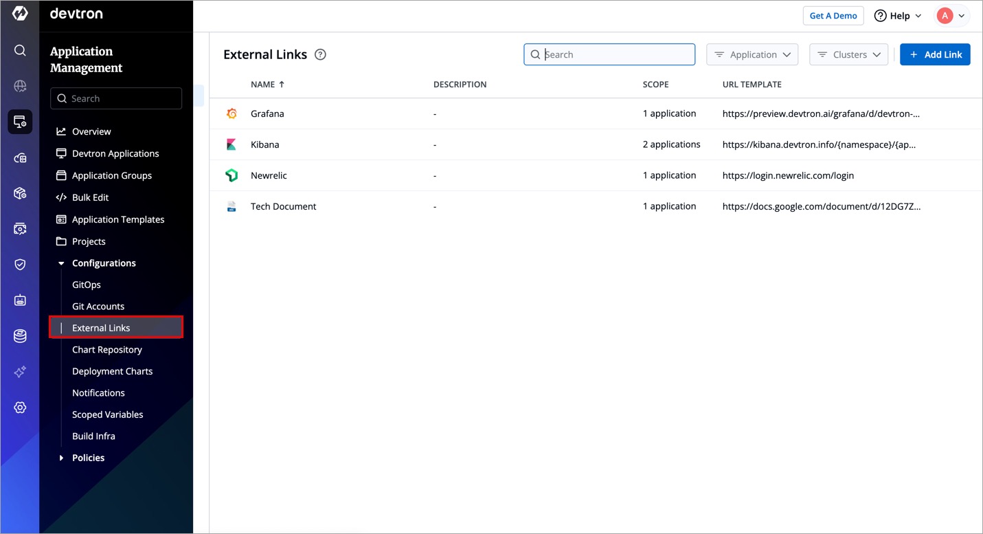 External Links allow you to connect to the third-party applications within your Devtron dashboard for seamlessly monitoring/debugging/logging/analyzing your applications. You can select from the pre-defined third-party applications such as Grafana to link to your application for quick access.
