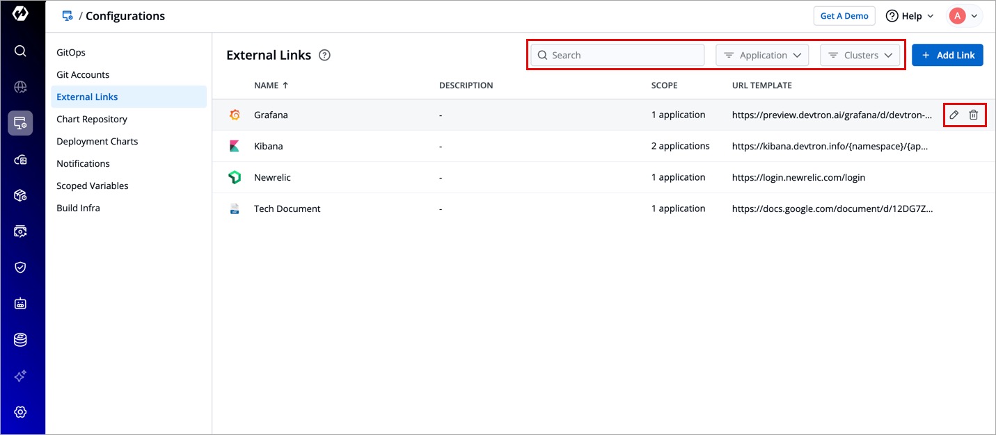 - Delete an external link by selecting the delete icon next to a link. The bookmarked link will be removed in the clusters for which it was configured.