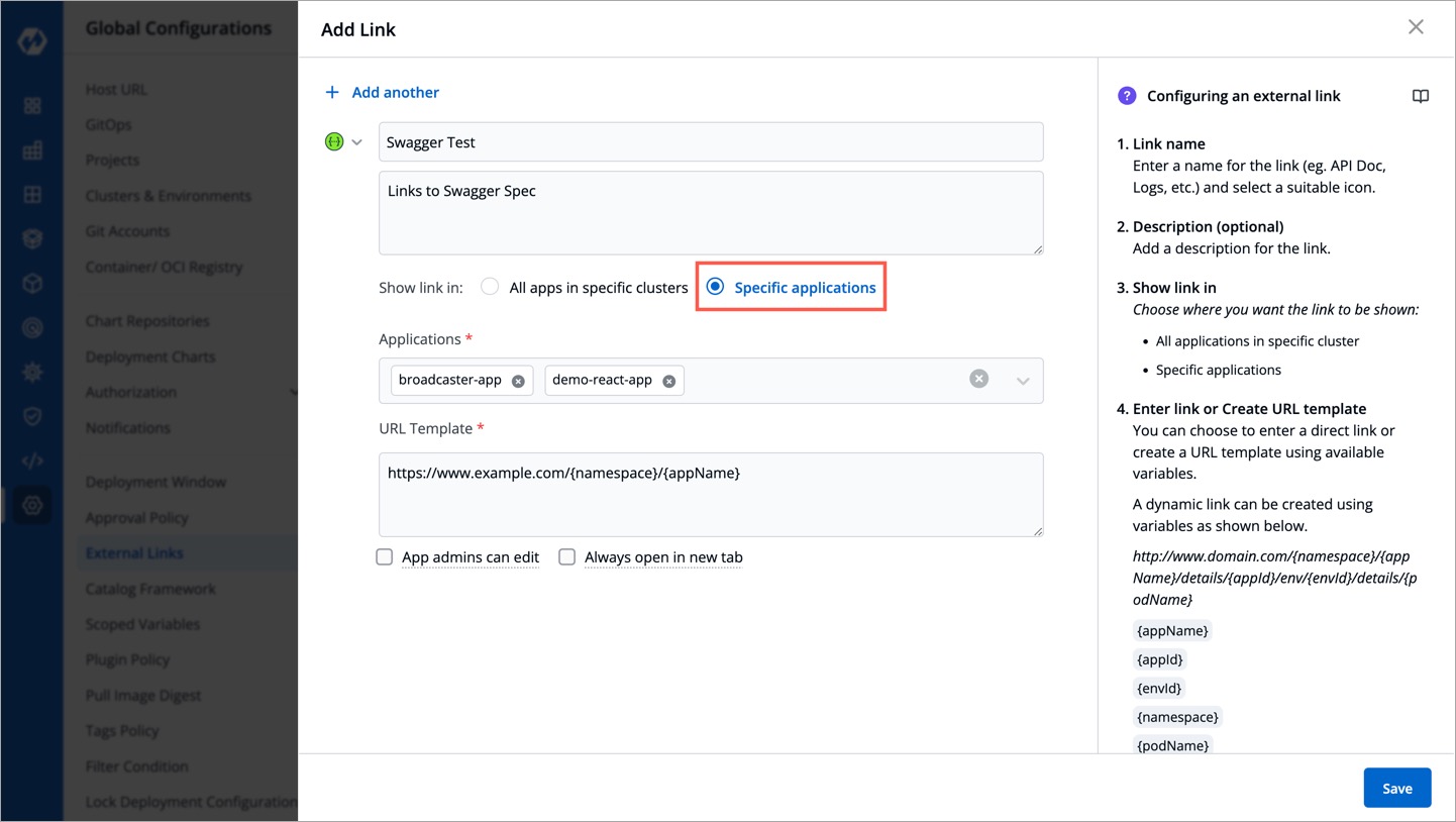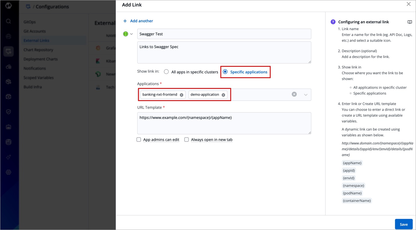 | Show link in | - All apps in specific clusters: Select this option to select the cluster. - Specific applications: Select this option to select the application. |