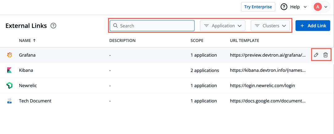On the External Links page, the configured external links can be filtered/searched, as well as edited/deleted.