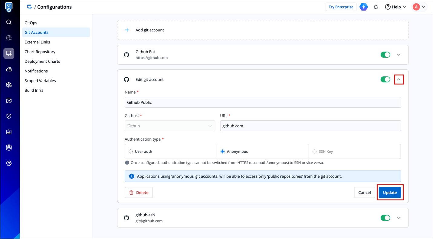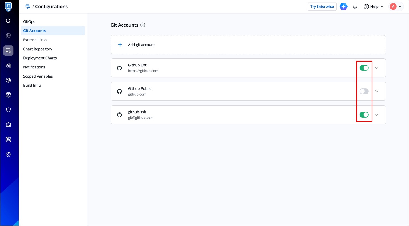 - You can enable or disable a git account. Enabled git accounts will be available on the Configurations (tab) → Git repository.