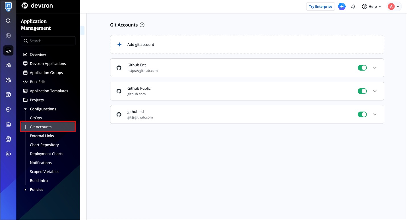 Git Accounts allow you to connect your code source with Devtron. You will be able to use these git accounts to build the code using the CI pipeline.