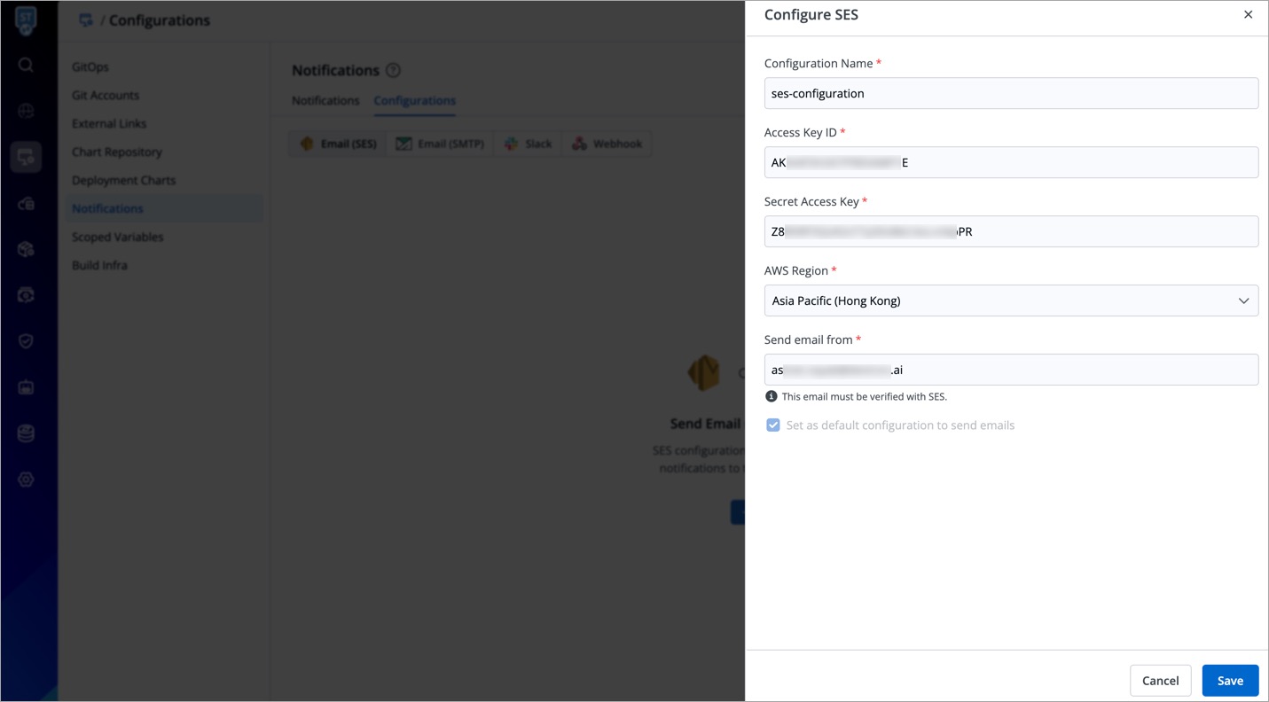 Navigate to the Application Management → Configurations → Notifications → Configurations → Email (SES) → Add SES.
