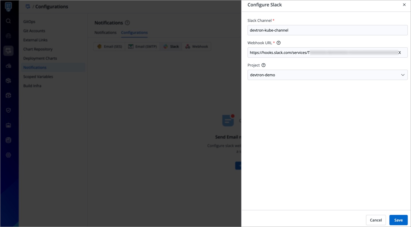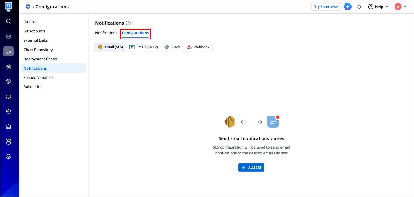 Configurations - Allows you to configure the way (Email SES, Email SMTP, Slack, Webhook) through which the notifications will be delivered.