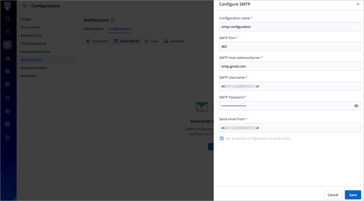 Key Description Configuration Name Give a name to your SMTP Configuration, e.g., qa-smtpSMTP Port The port number available in your SMTP settings, e.g., 587SMTP Host address/Server The SMTP endpoint available in your SMTP settings, e.g., smtp.gmail.comSMTP Username A valid username created with your SMTP provider, e.g., AKIAWEAVHF123ABCD123in case of AWS SMTP andjohndoe@gmail.comin case of Gmail SMTP.SMTP Password The password generated by your SMTP provider Send email from The sender email address verified by your SMTP provider for sending emails -