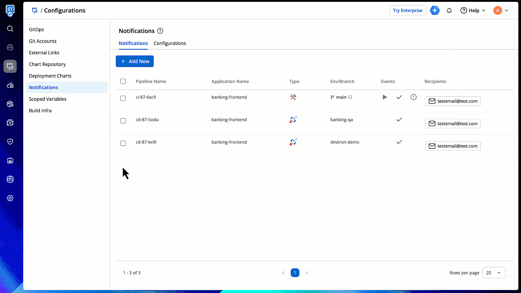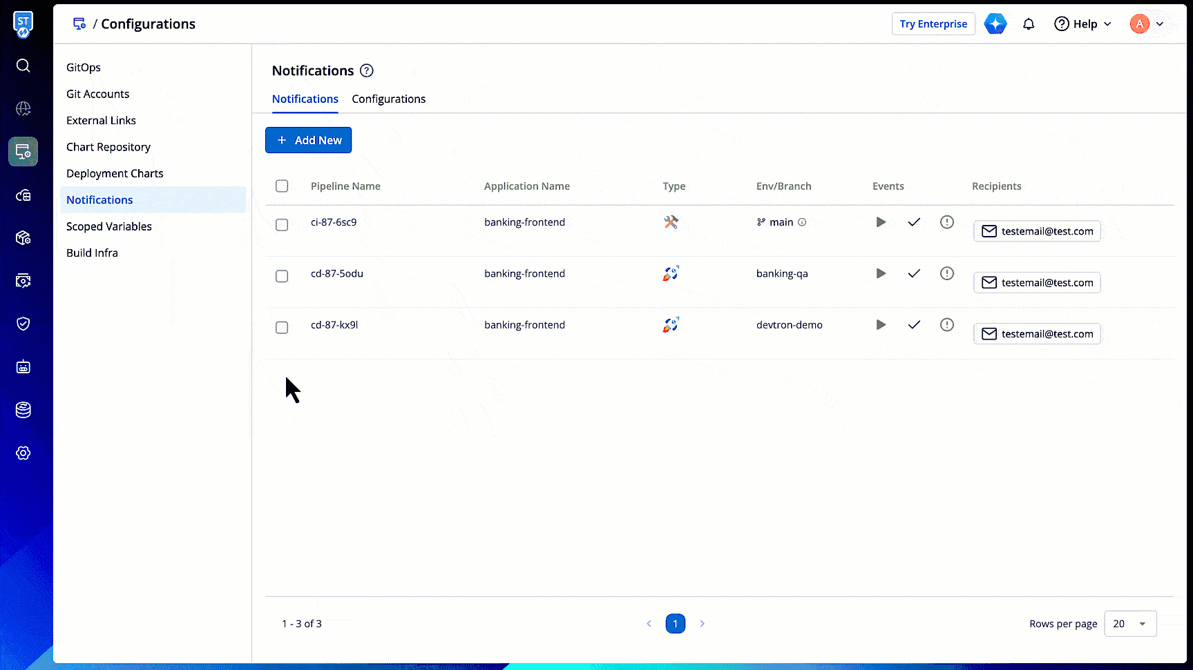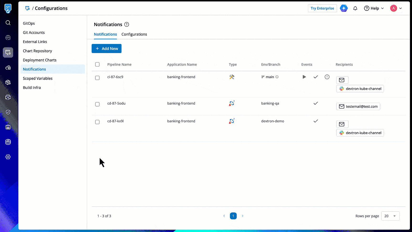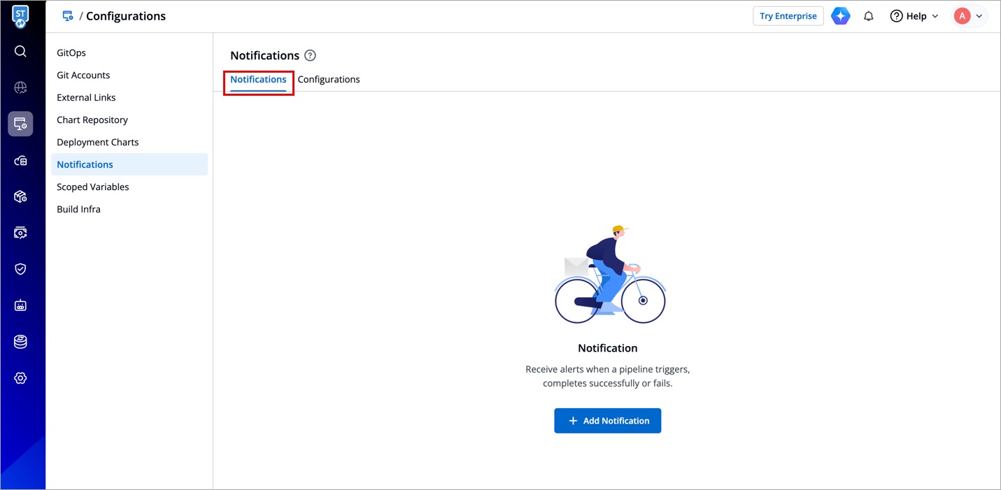 The Notifications page allows you to configure and manage notifications for your CI/CD pipeline(s). To access the Notifications page, navigate to Application Management → Configurations → Notifications.