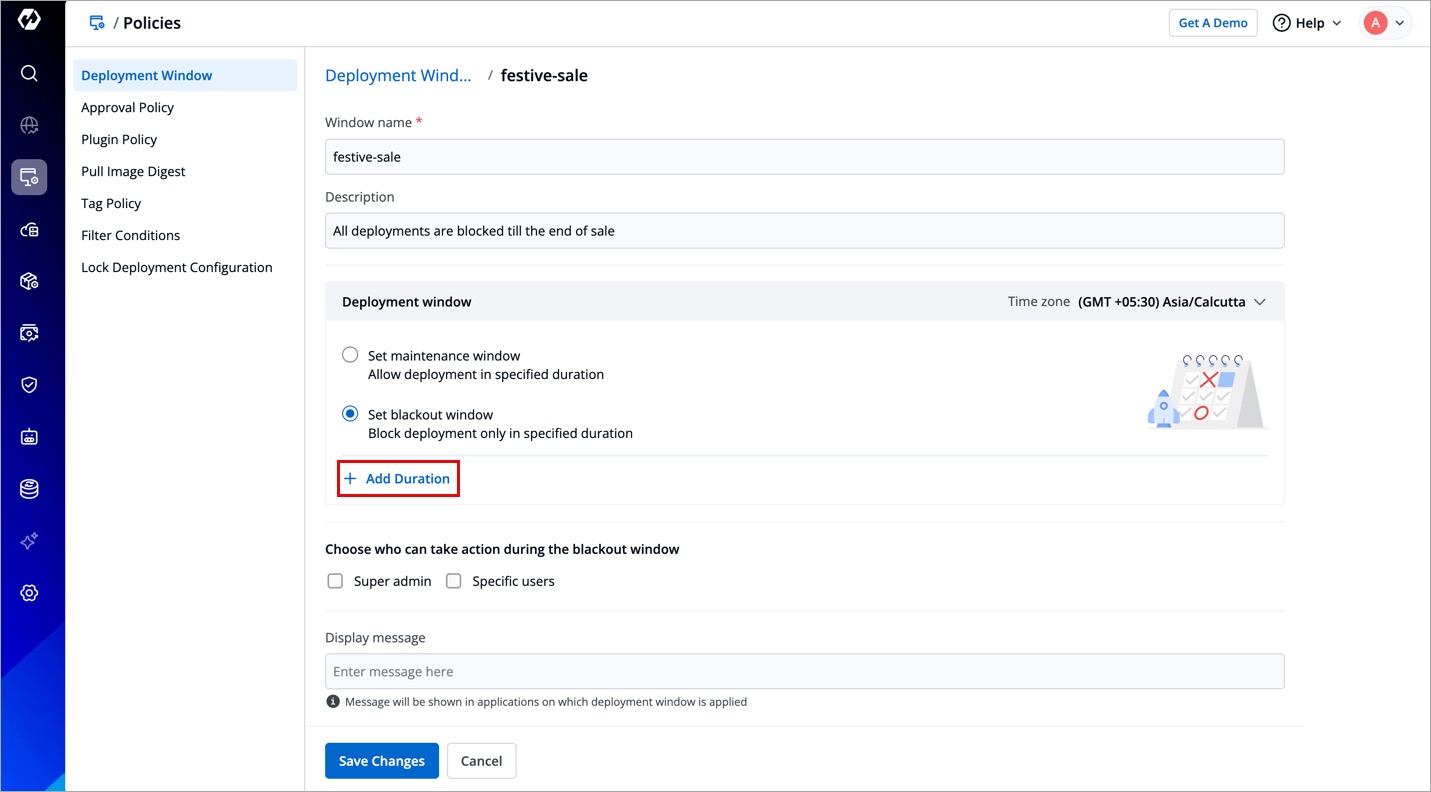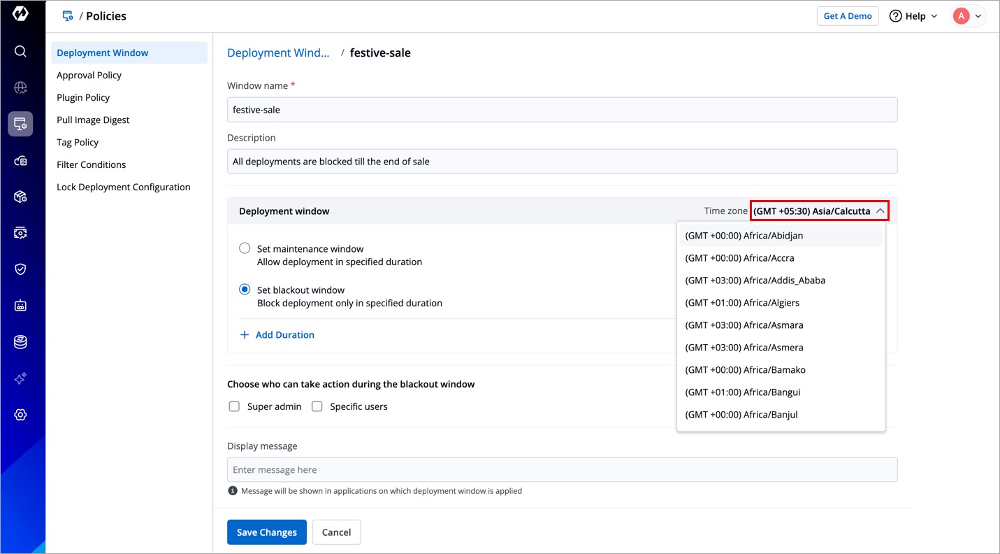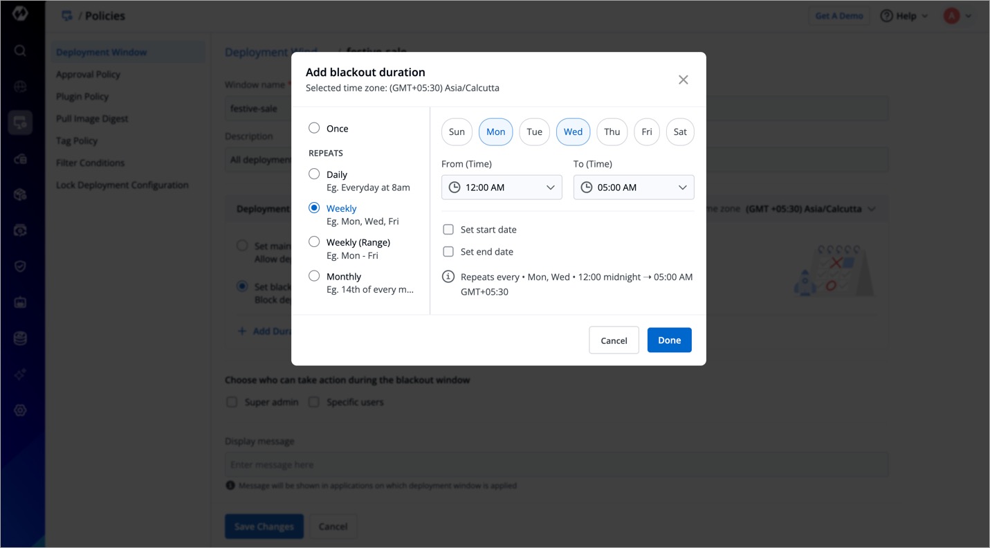 Let's say you are a super-admin located in New Delhi (GMT +5:30) and you wish to restrict midnight deployments according to the Californian timings (GMT -07:00) for your team in the US. Therefore, it's crucial to choose the correct time zone (i.e., GMT -07:00) and then add the duration (see next steps).