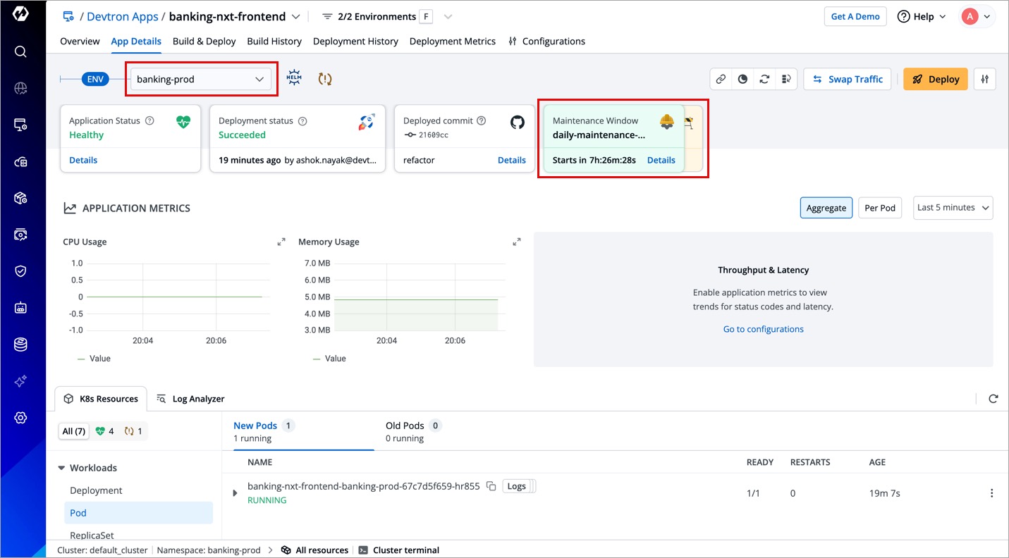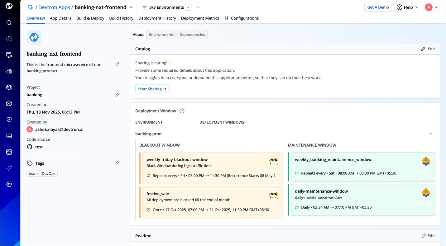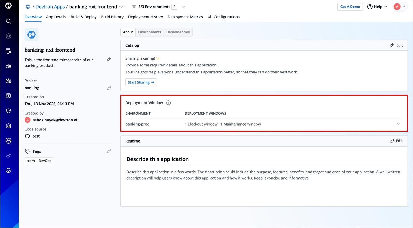 Unlike the Overview page which shows deployment windows for all environments, the App Details page does not show all deployment windows configured for the environment. It shows: