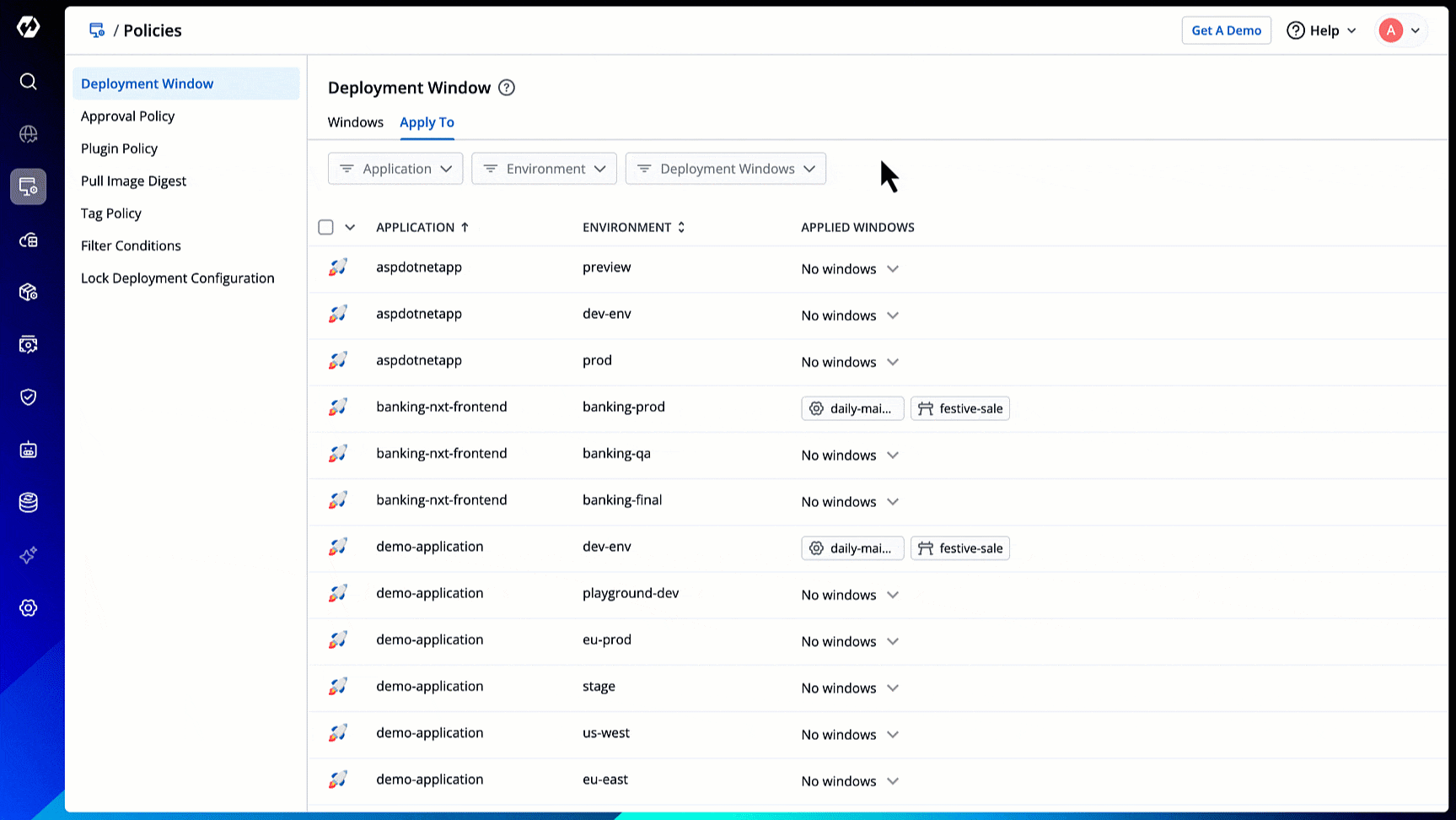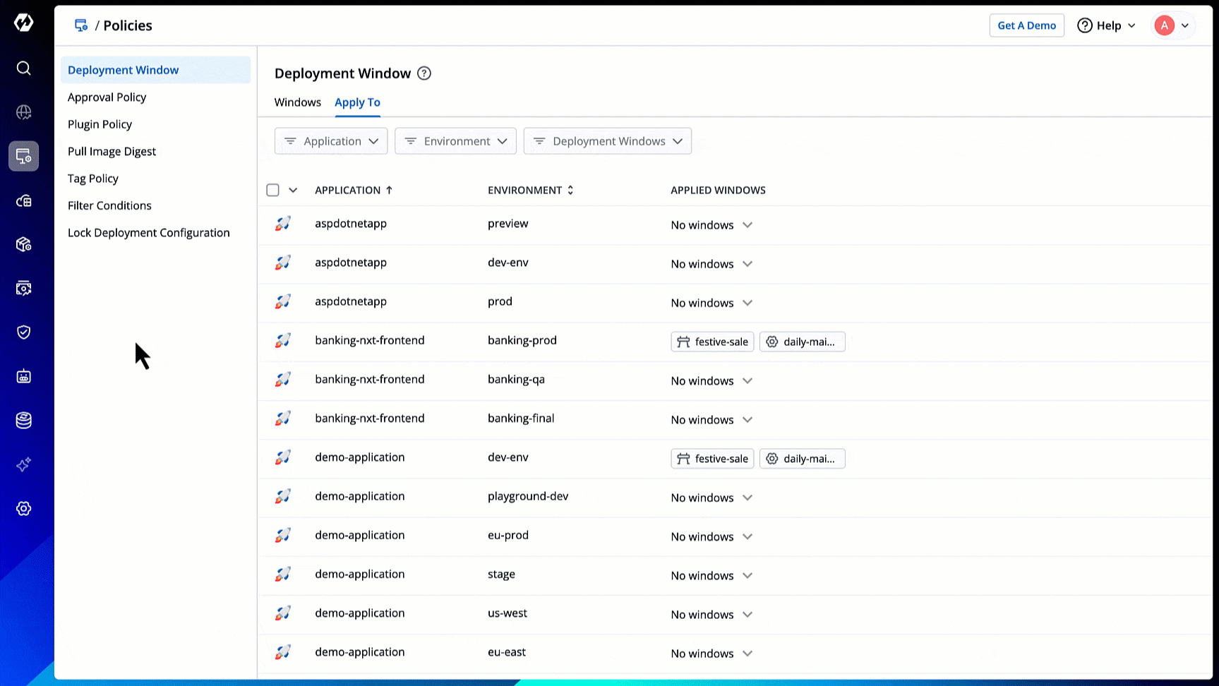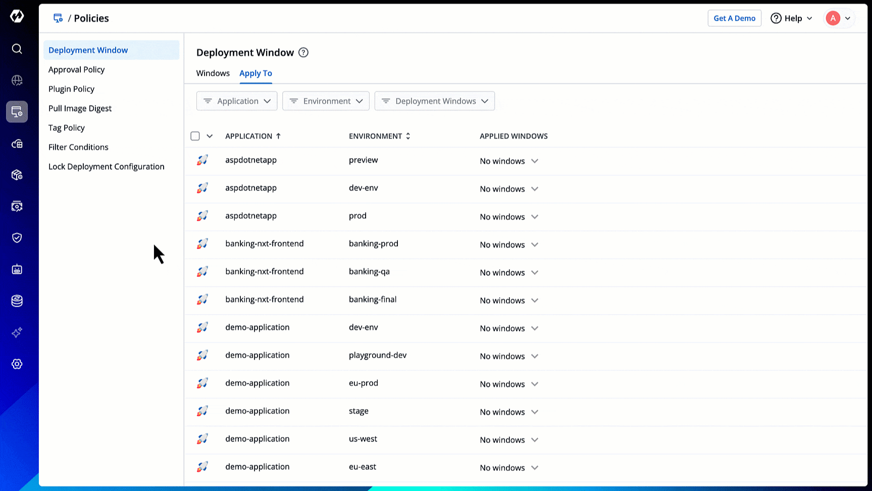 However, if a deployment window doesn't exist for an environment, the message No deployment windows are configured would be displayed next to it.
