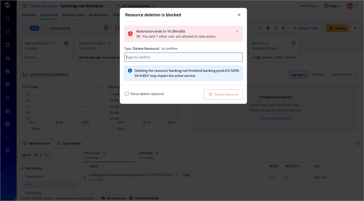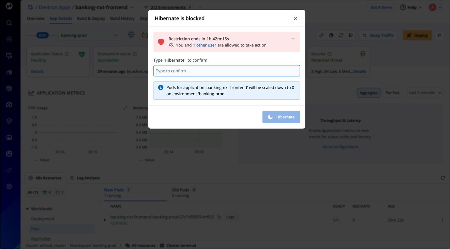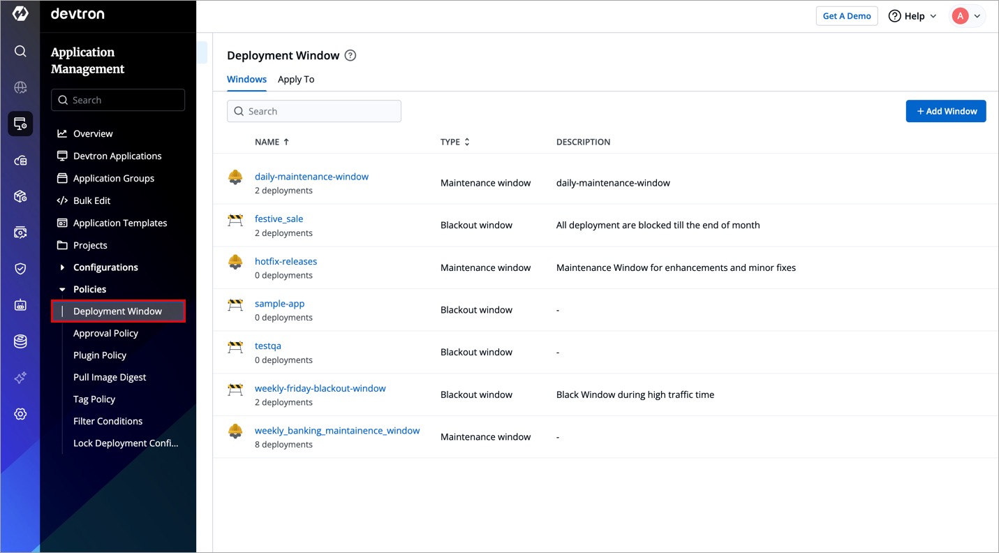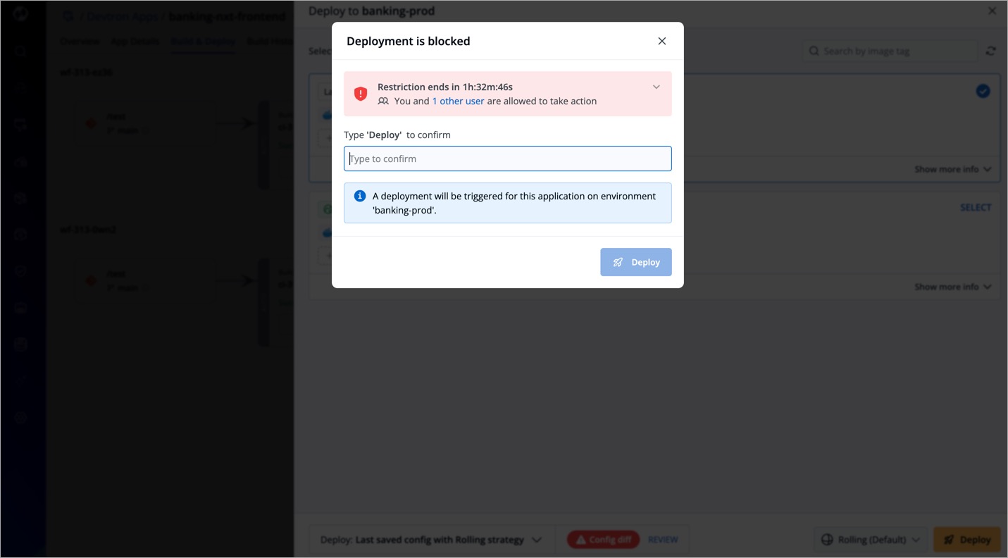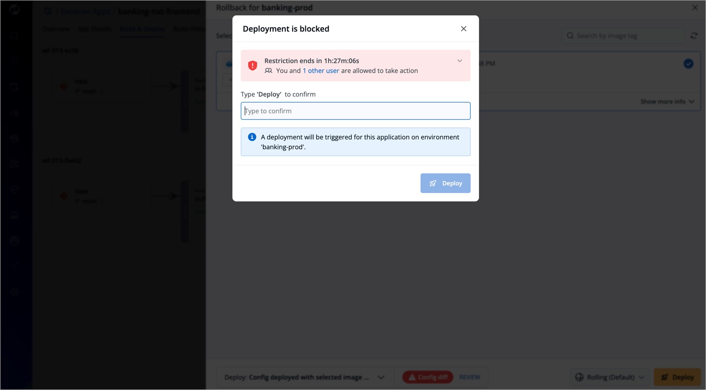 Therefore, Devtron comes with a feature called 'Deployment Window' that allows you to define specific timeframes during which application deployments are either blocked or allowed in specific environments. Moreover, actions that can potentially impact the existing deployment are also restricted, which include:
