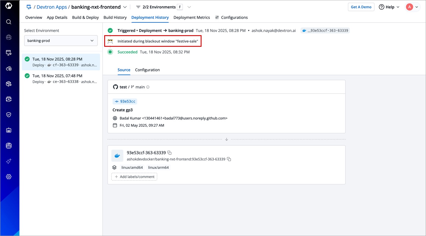The Deployment History tab will also log whether a given deployment was initiated during a blackout window or outside a maintenance window.