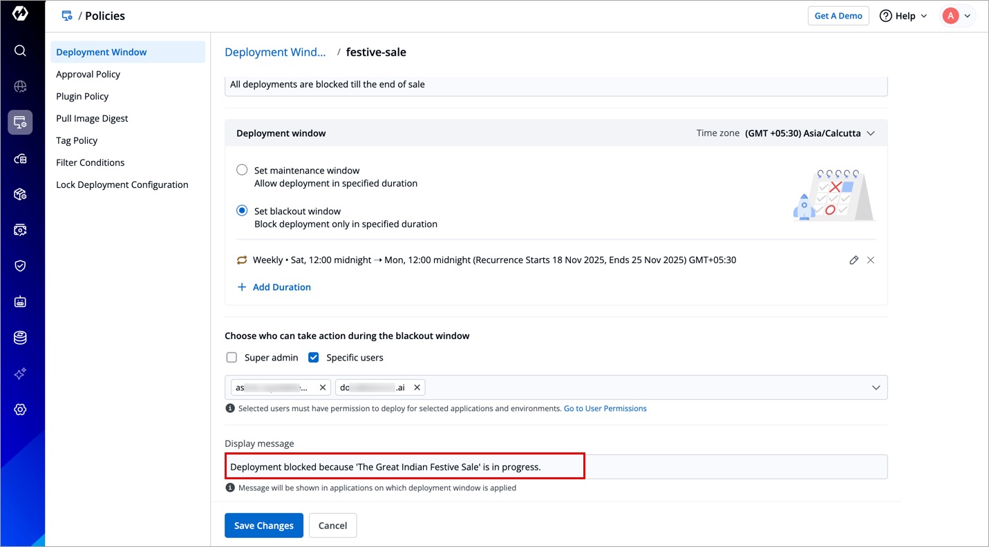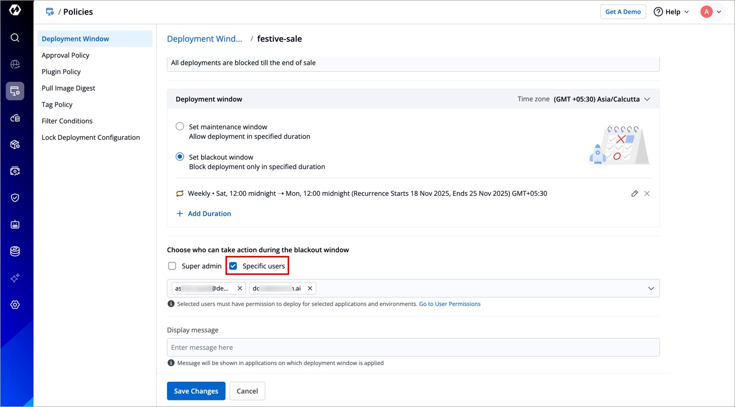 You can also determine the users who can take actions (say deployment) even when restrictions are in place. These can be super-admins, specific users, both, or none.