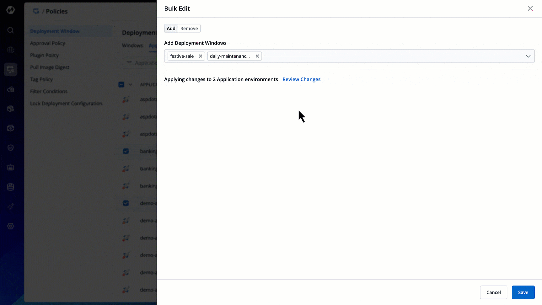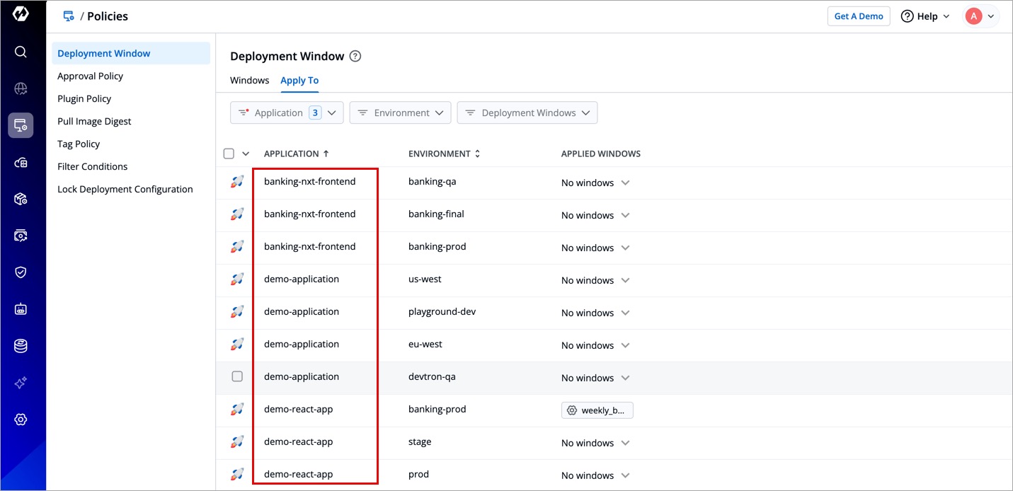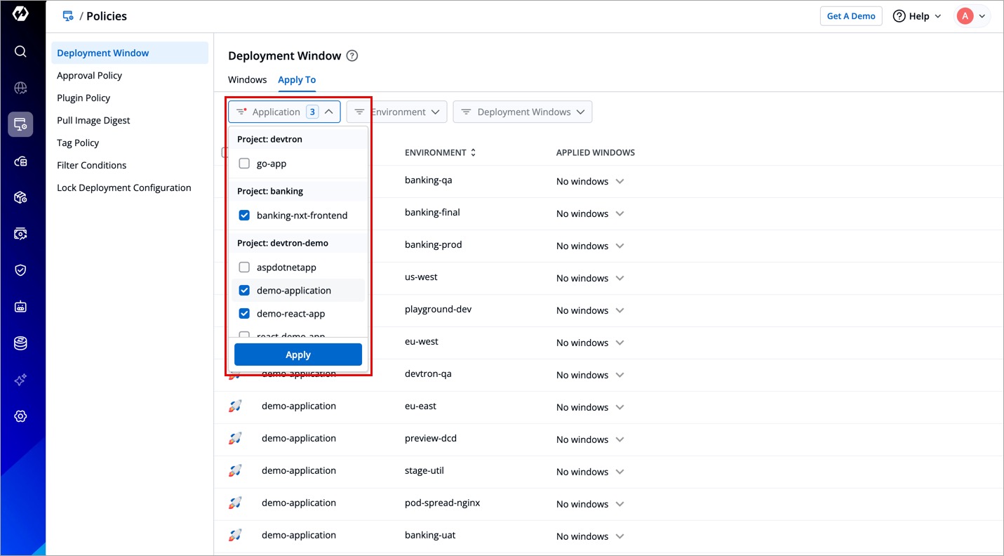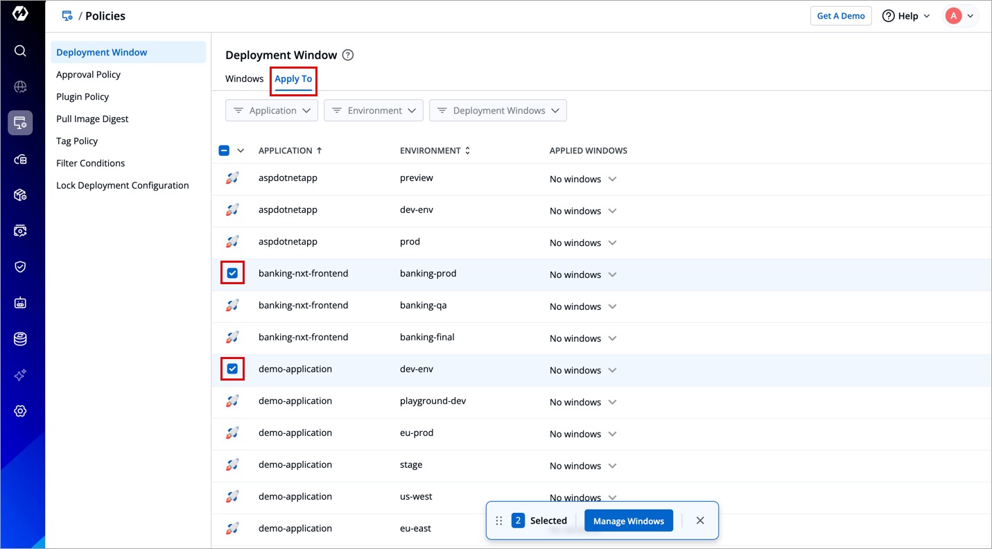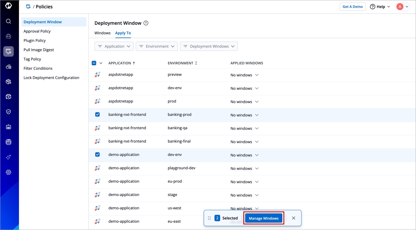 If you wish to apply deployment windows to multiple applications and environments at once, use the checkbox.