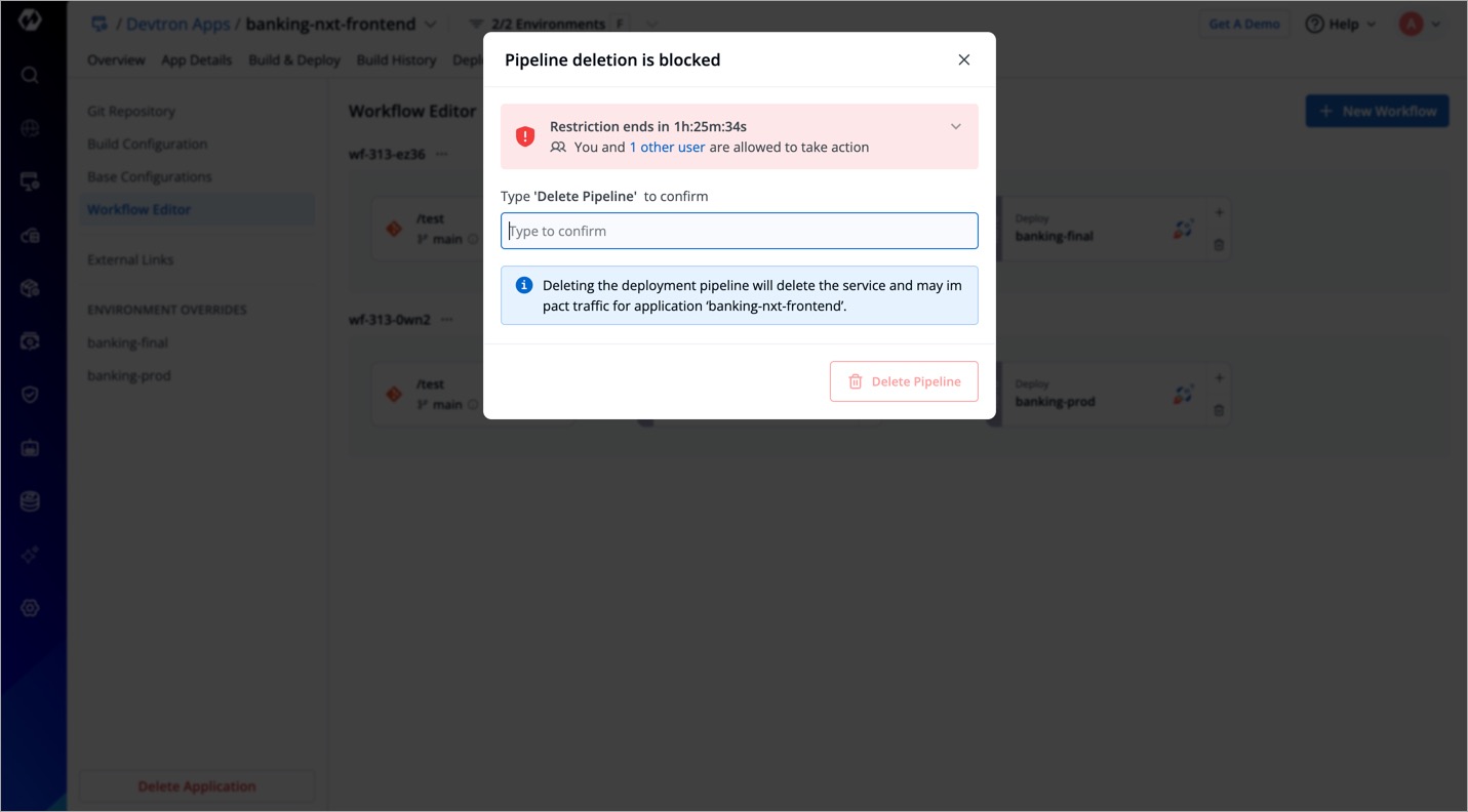 If you attempt to delete any CD pipeline with restricted deployment, it will show Pipeline deletion is blocked.