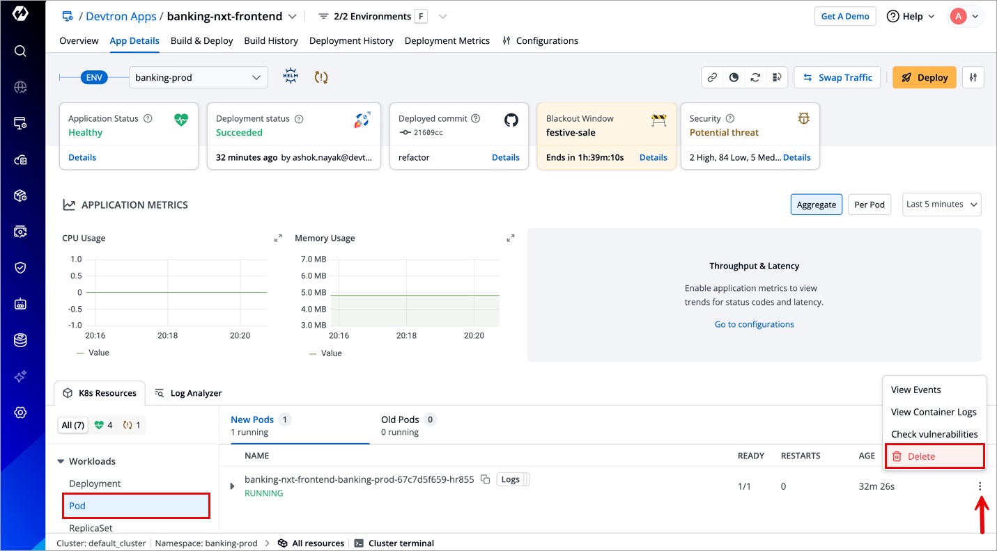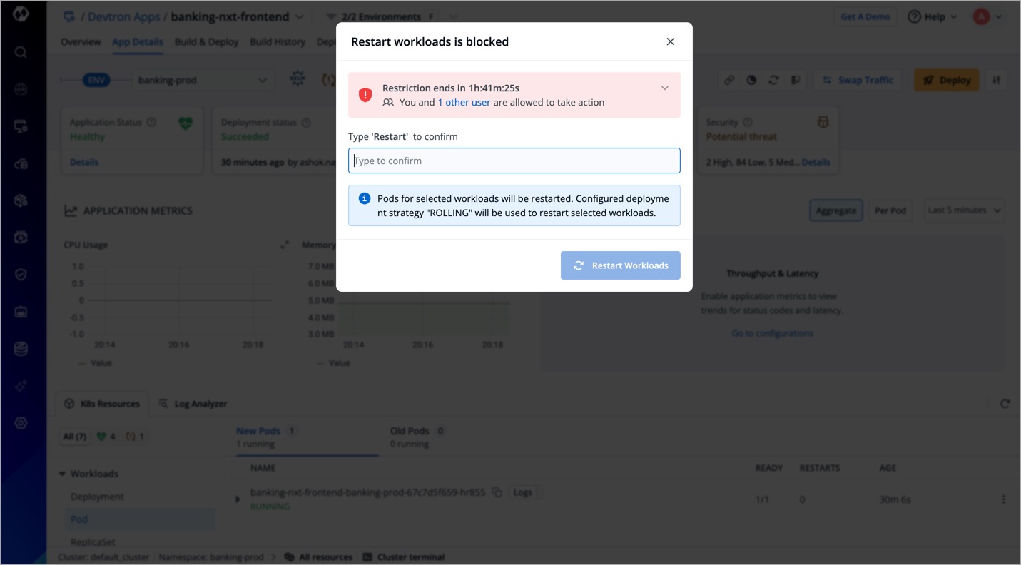 Although Kubernetes handles the restart process smoothly, there is a possibility of interruptions or downtime. To avoid this, restarting workloads (say Pod, Deployment, ReplicaSet) of an application is blocked when deployment is restricted.