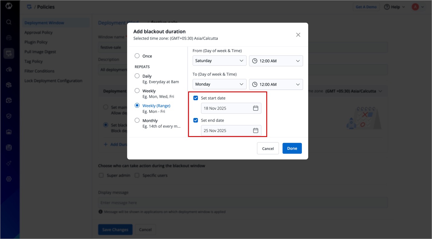 Let's say you wish to enforce a blackout window every weekend to prevent unsolicited deployments by your team. If you select a weekly range (e.g., Saturday 12:00 AM to Monday 12:00 AM) and apply the deployment window without specifying dates, the weekend restrictions will persist indefinitely.