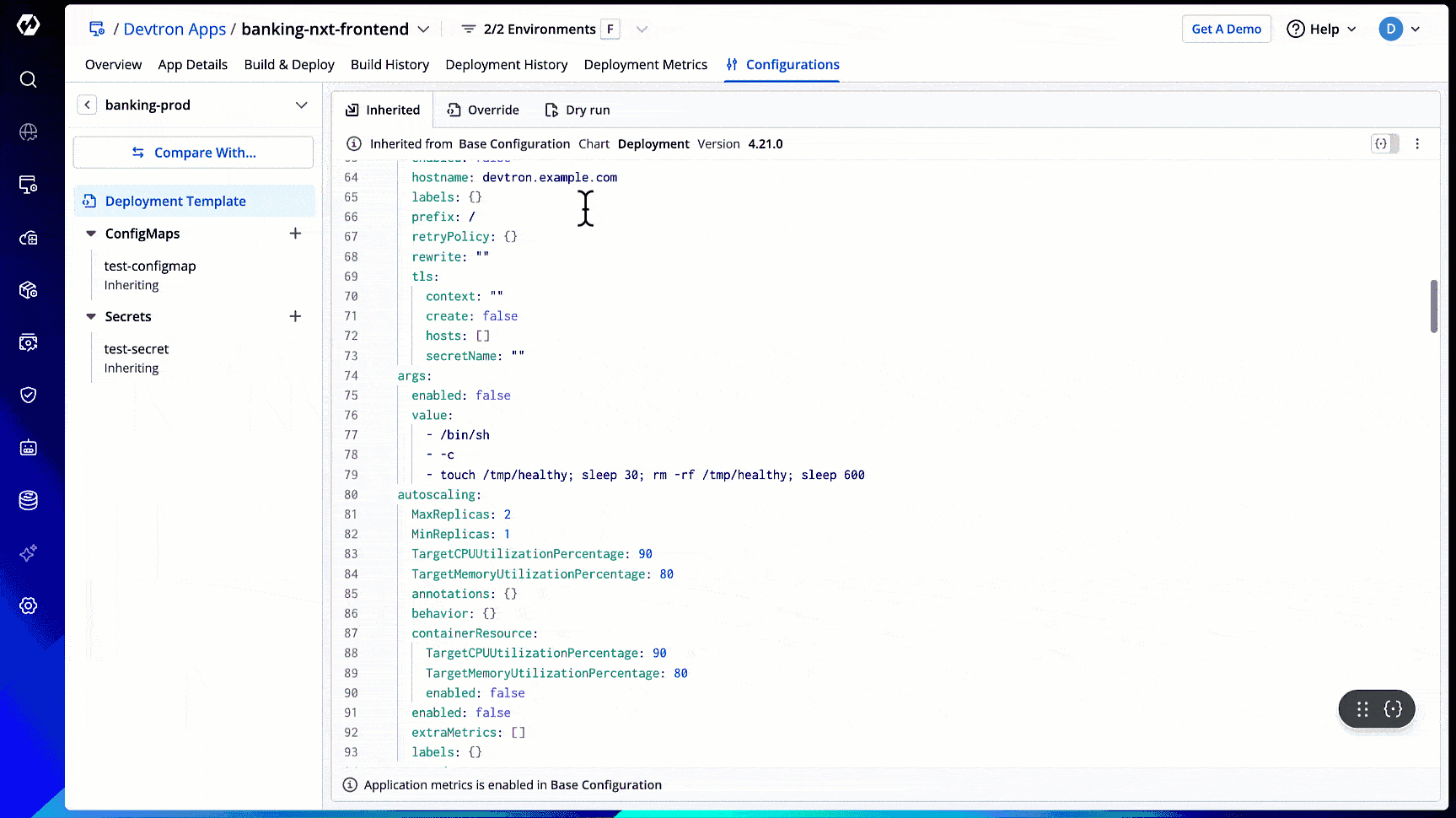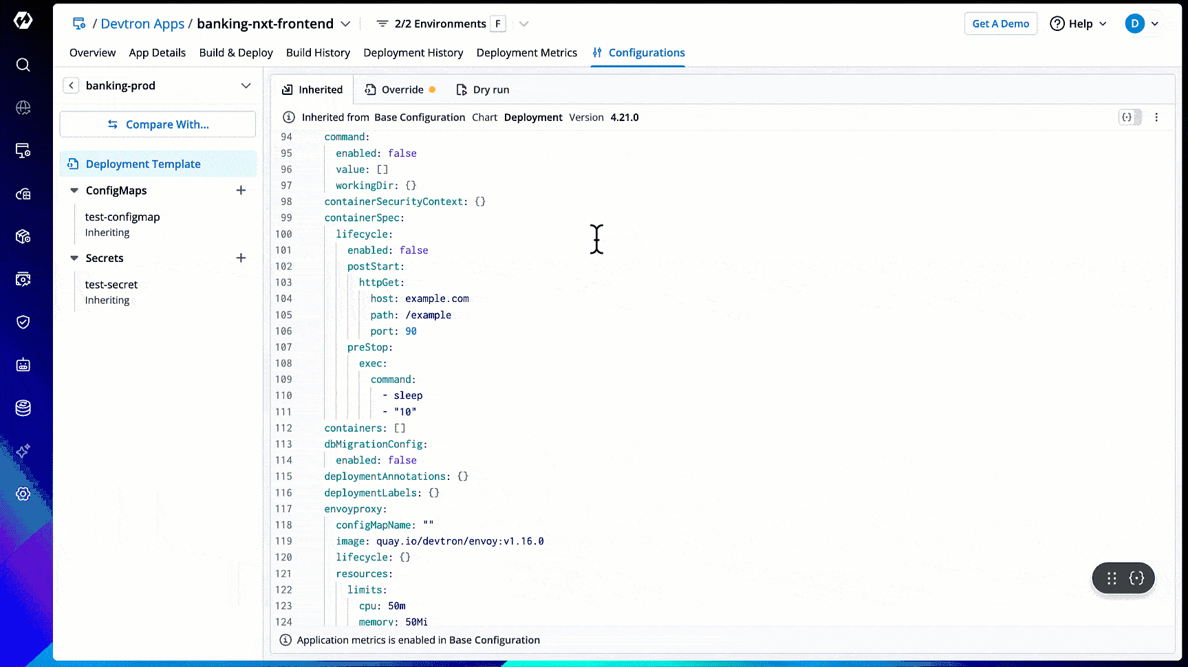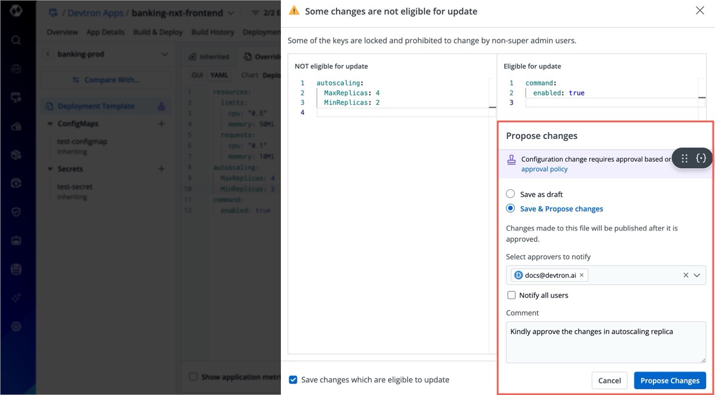 The 'protect configuration' feature is meant to verify the edits by introducing an approval flow for any changes made to the configuration files, i.e., Deployment template, ConfigMaps, and Secrets. Refer Approval Policy.