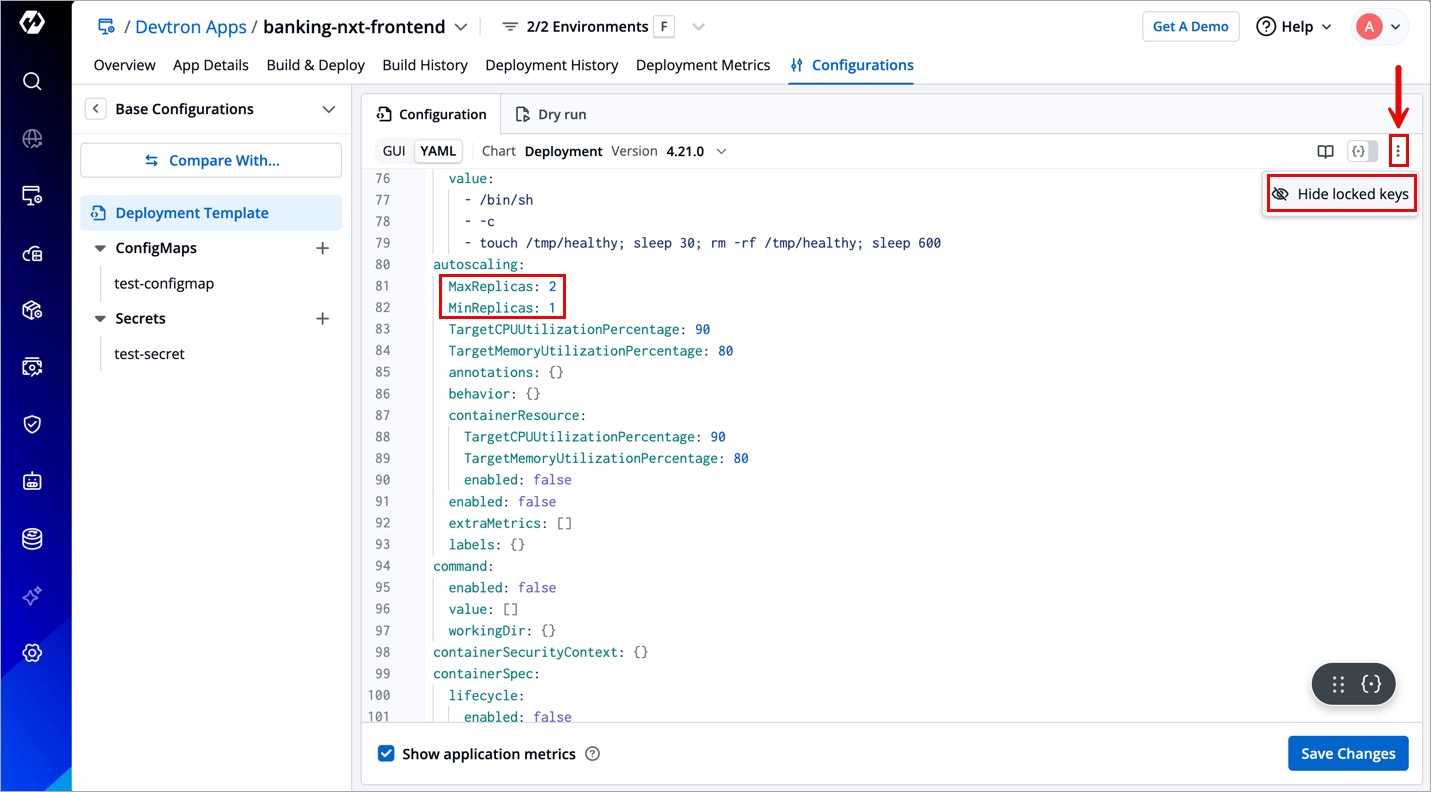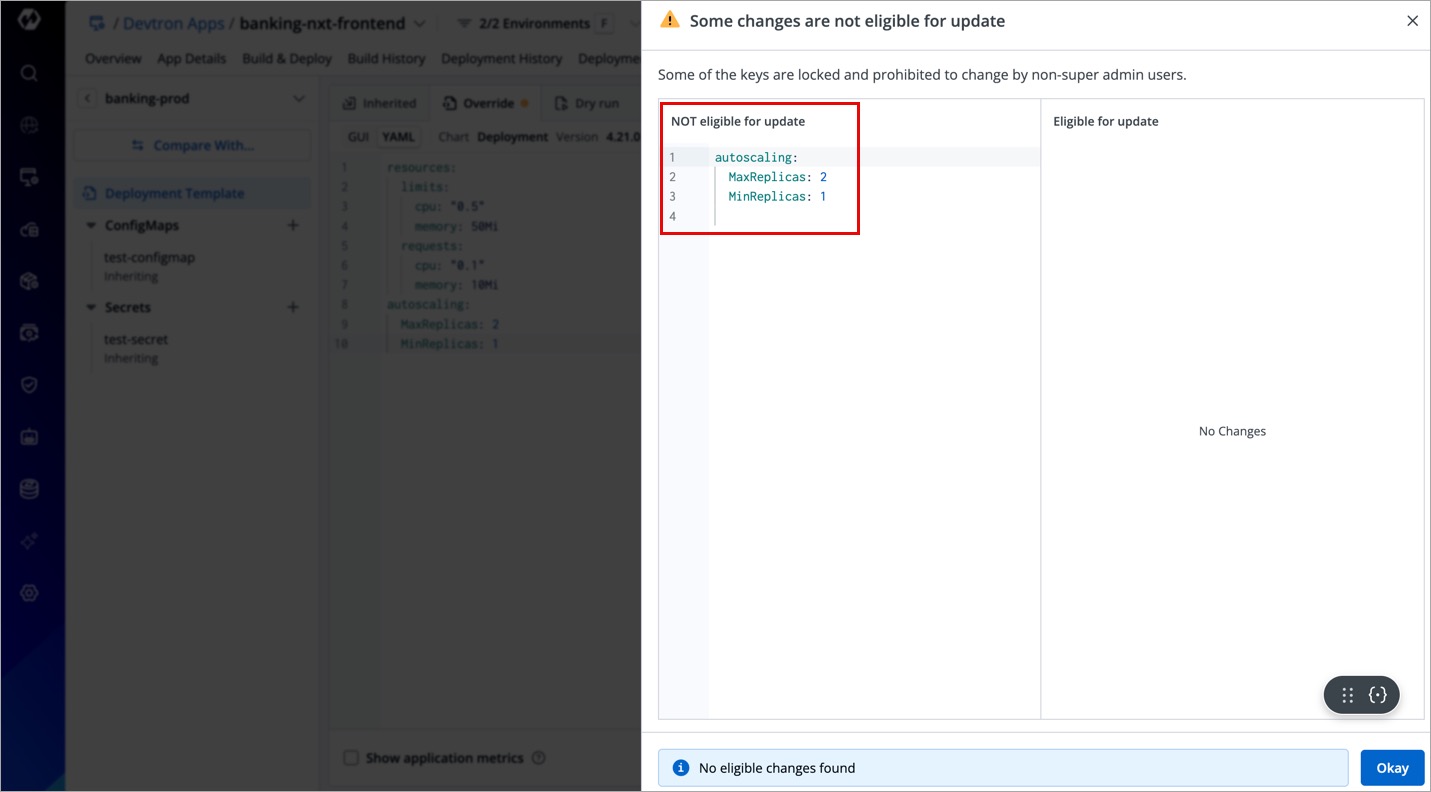The Deployment Template might contain certain configurations (e.g., ingress) that are critical to the stability and security of the applications. To prevent unauthorized or accidental changes to such configurations, Devtron allows super admins to restrict (lock) such critical configurations from modification or deletion.