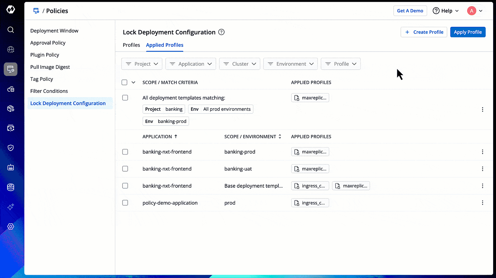A lock deployment configuration profile is a template that specifies which configurations (keys) in the deployment template cannot be edited or deleted by non-super admin users. By using lock deployment configuration profiles, super-admins can manage edit access at different levels, such as global, cluster, environment, application, or a combination of application and environment.