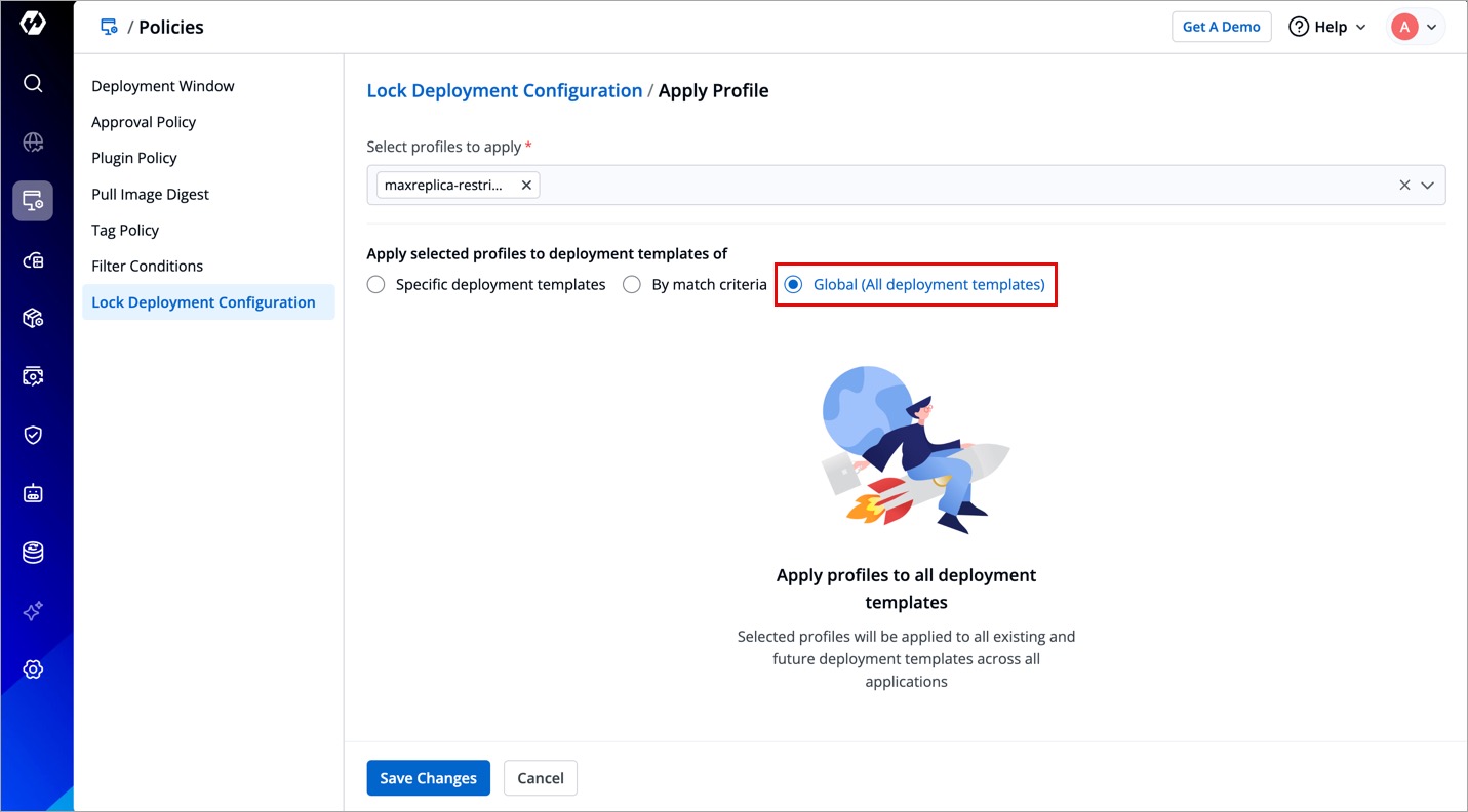 Global (All deployment templates): This option allows you to apply the lock deployment configuration profile to all the existing and future deployment templates across all the applications.