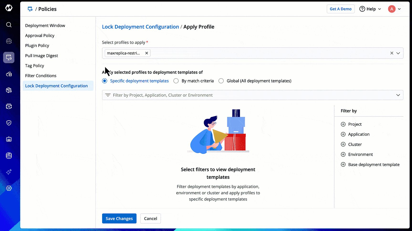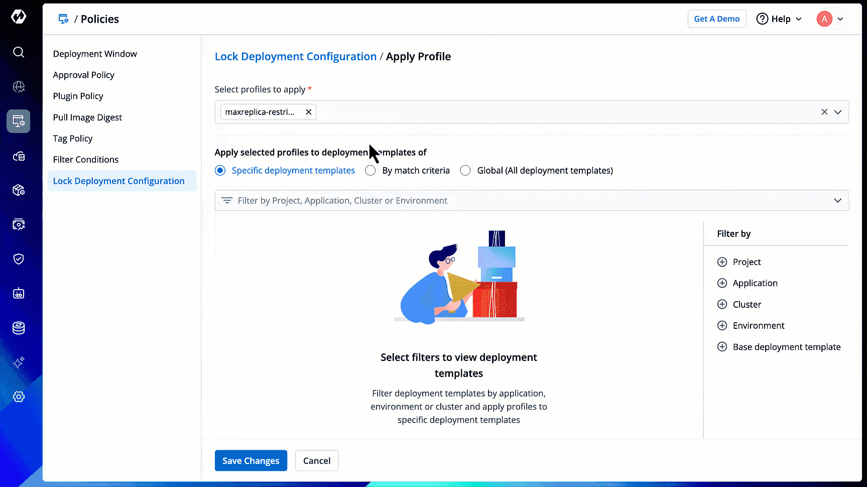 Specific deployment templates: This option allows you to apply the lock deployment configuration profile to the deployment template(s) of specific application(s) within particular environment(s).
