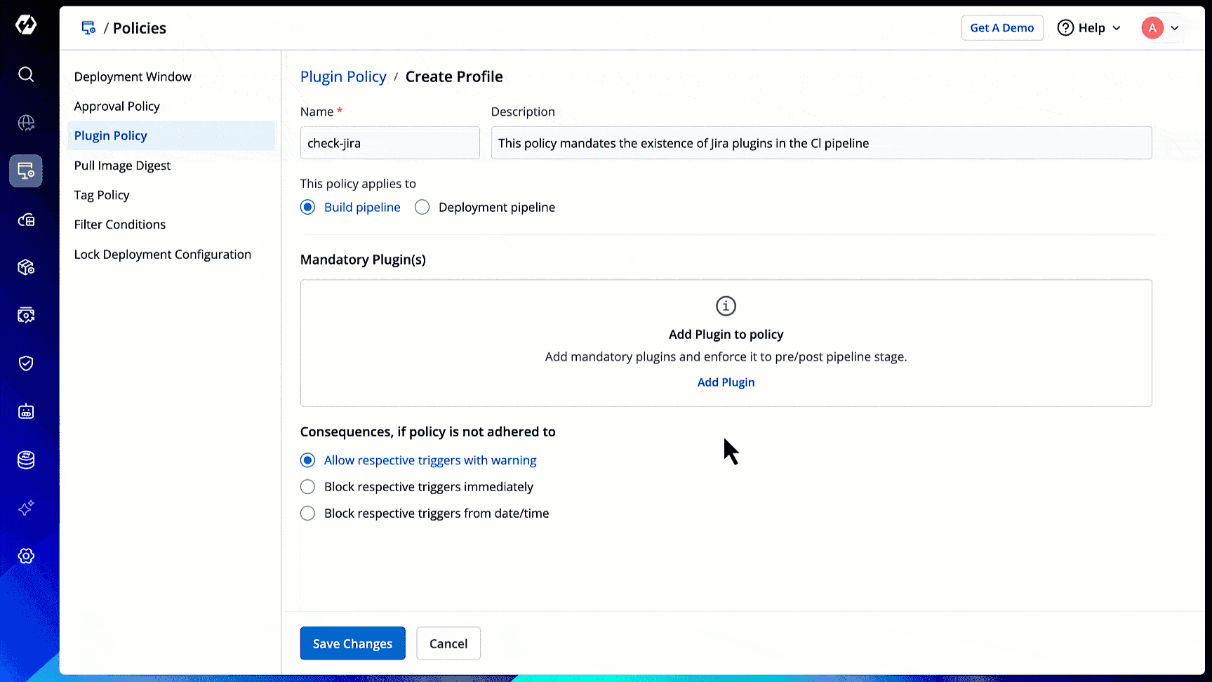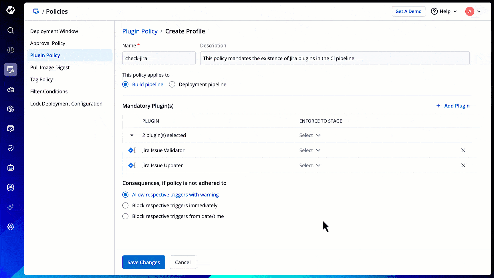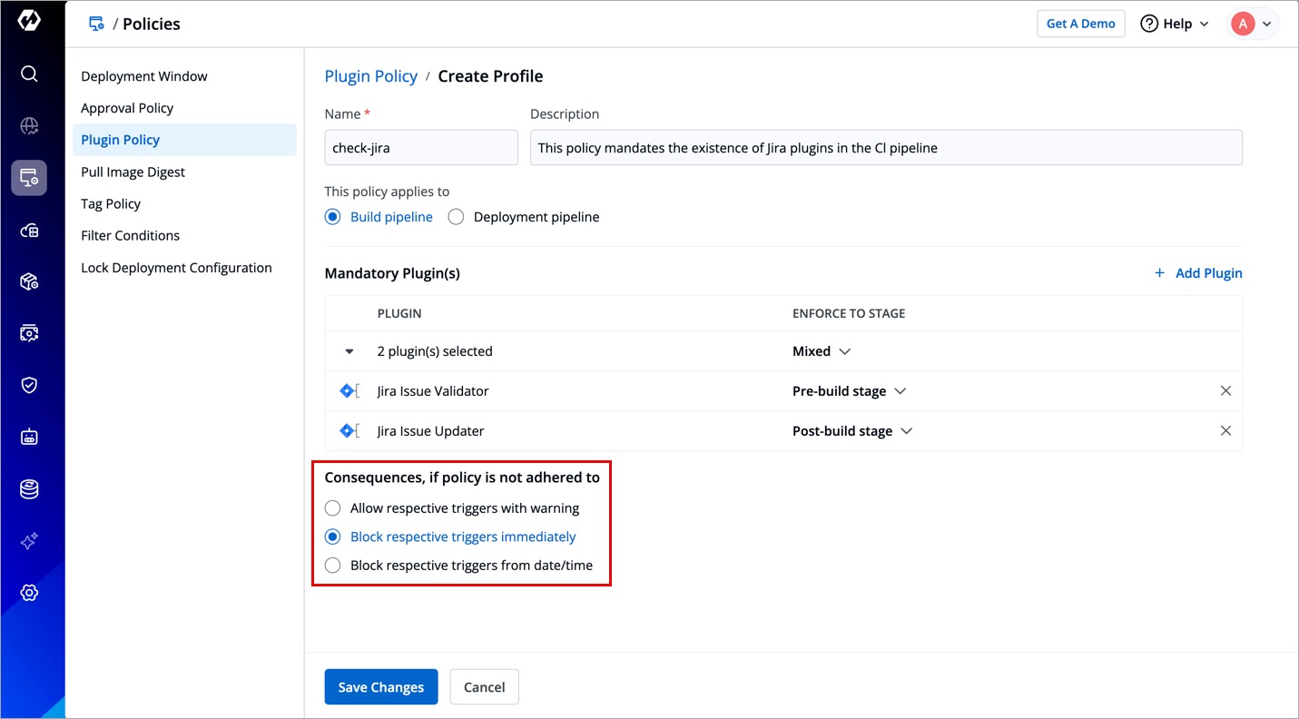 - Block respective triggers from date/time - This will allow the non-compliant pipeline to run only till a given date and time. After that, it will block the non-compliant pipeline unless the user configures the mandatory plugins.
