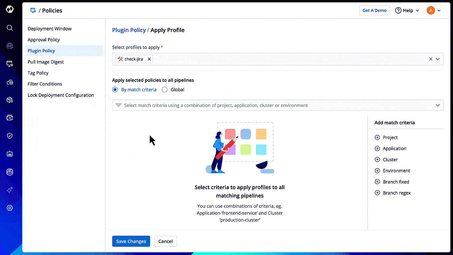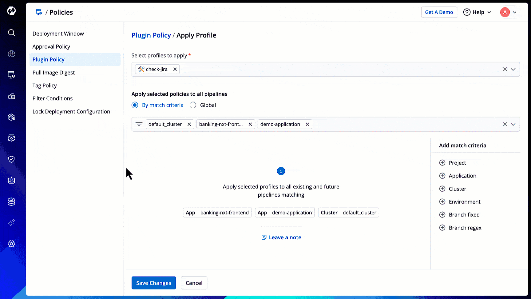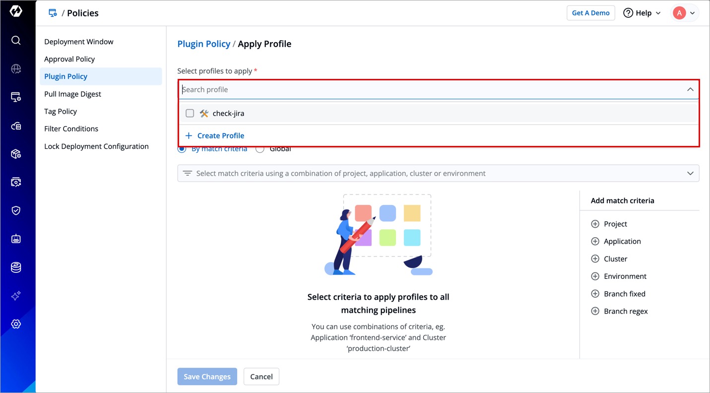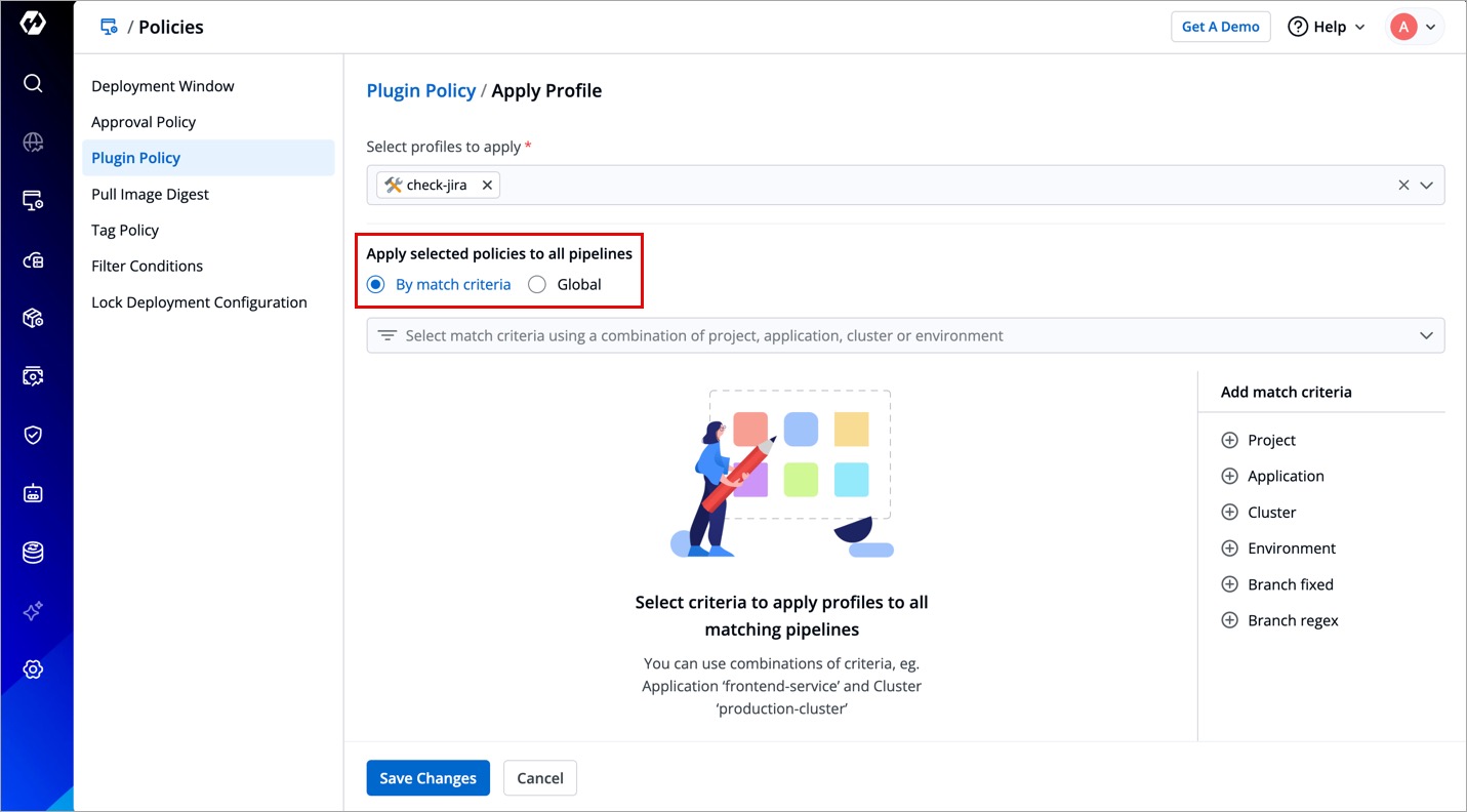 - By Match Criteria - Select this option to use a combination of filters to decide the target pipelines fulfilling your criteria. Your policy will only apply to such target pipelines.