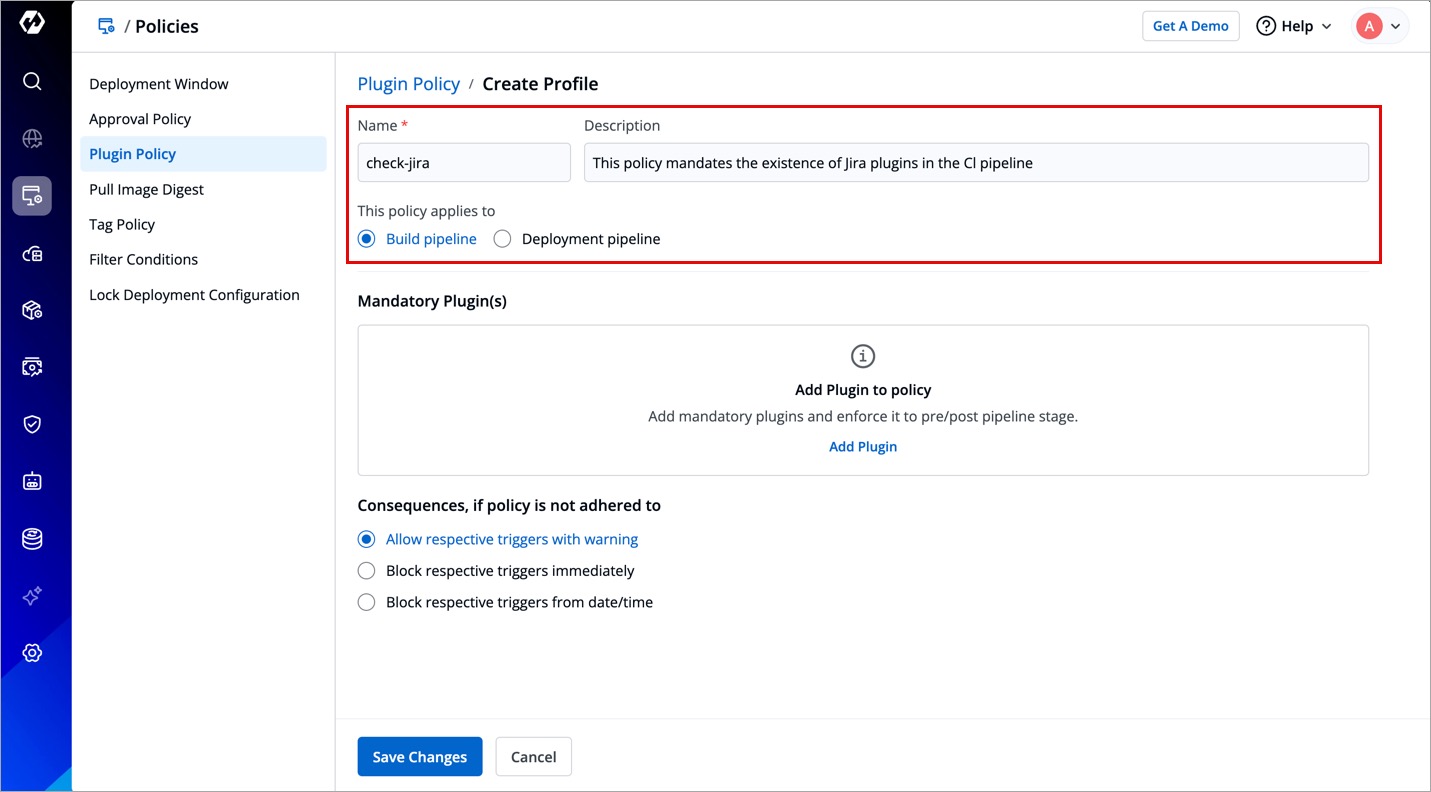 The Plugin Policy feature in Devtron lets you enforce the presence of specific plugins at various stages in your application's build and deployment pipelines, such as pre-build, post-build, pre-deployment, or post-deployment. Therefore, if the required plugins do not exist in the specified stage(s), you can decide the action (whether to allow or block the pipeline trigger).