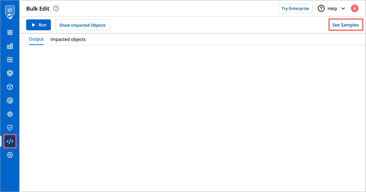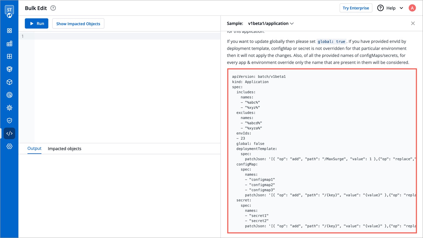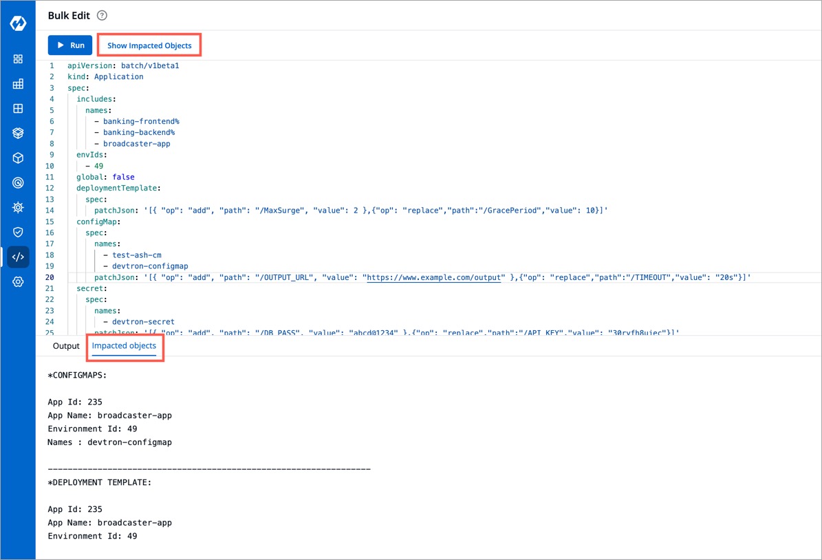 Bulk Editoption in the main navigation. This is where you can write and execute scripts to perform bulk updates in Devtron objects.