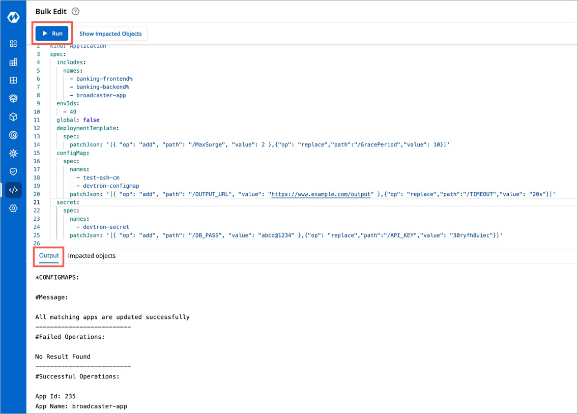 Eg. You can change the value for MaxReplicas in Deployment Templates of multiple Devtron applications or you can add key-value pairs in multiple ConfigMaps & Secrets. However, you might not be able to change the values of locked keys. Refer Lock Deployment Configuration to know more.