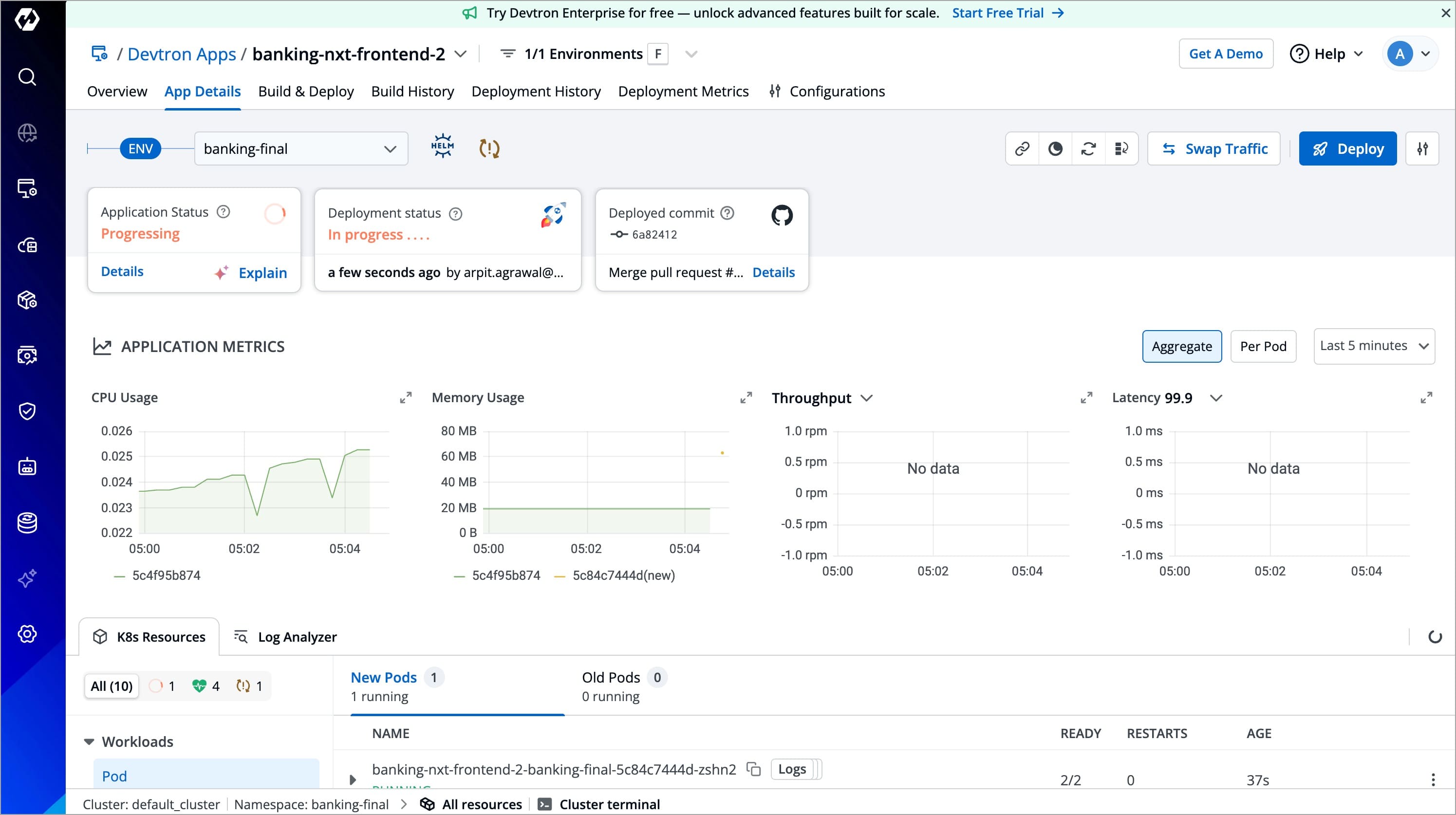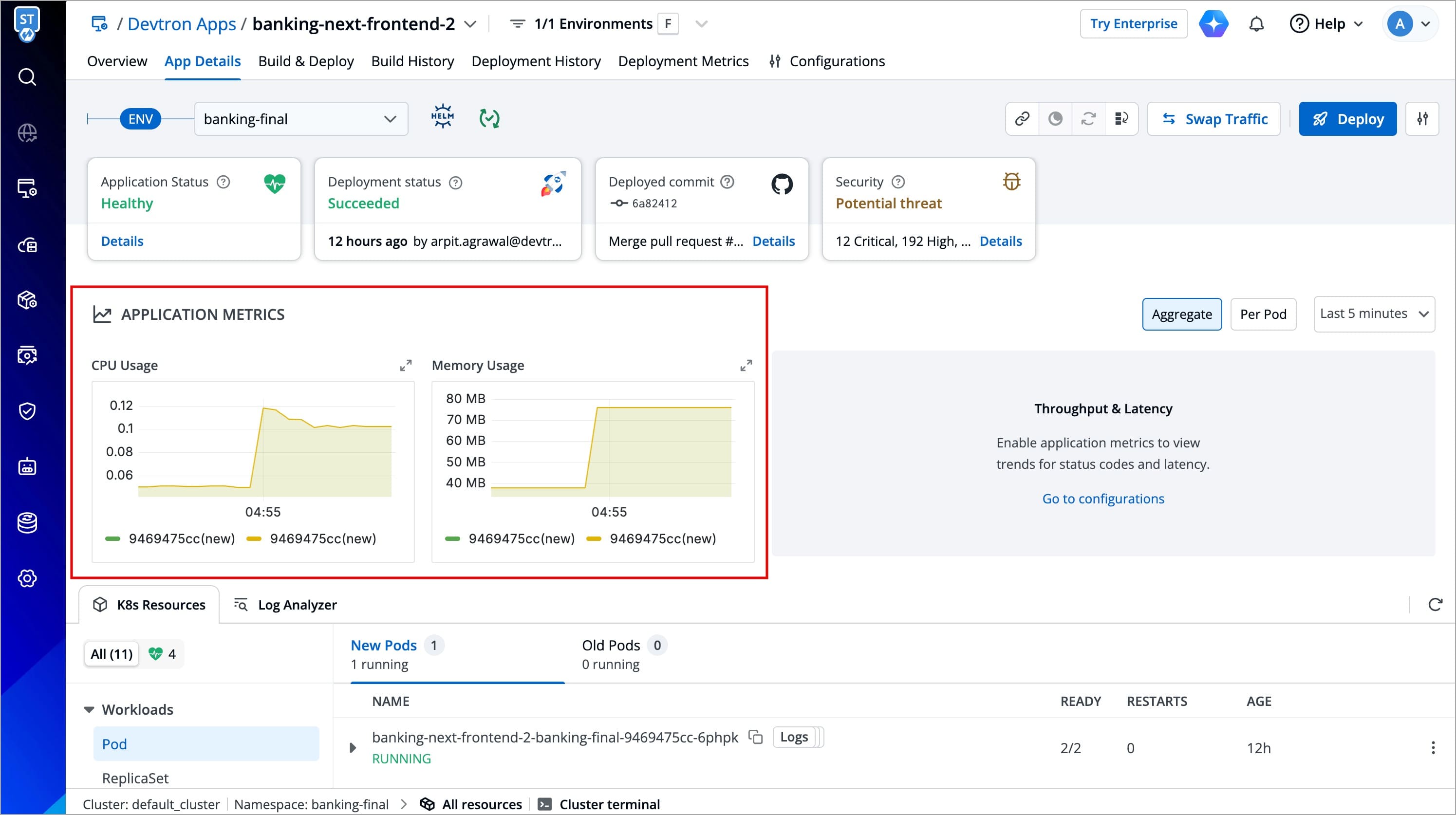 Now, you can track all your application metrics by navigating to Applications and going to the App Details page of your Devtron App as shown below.