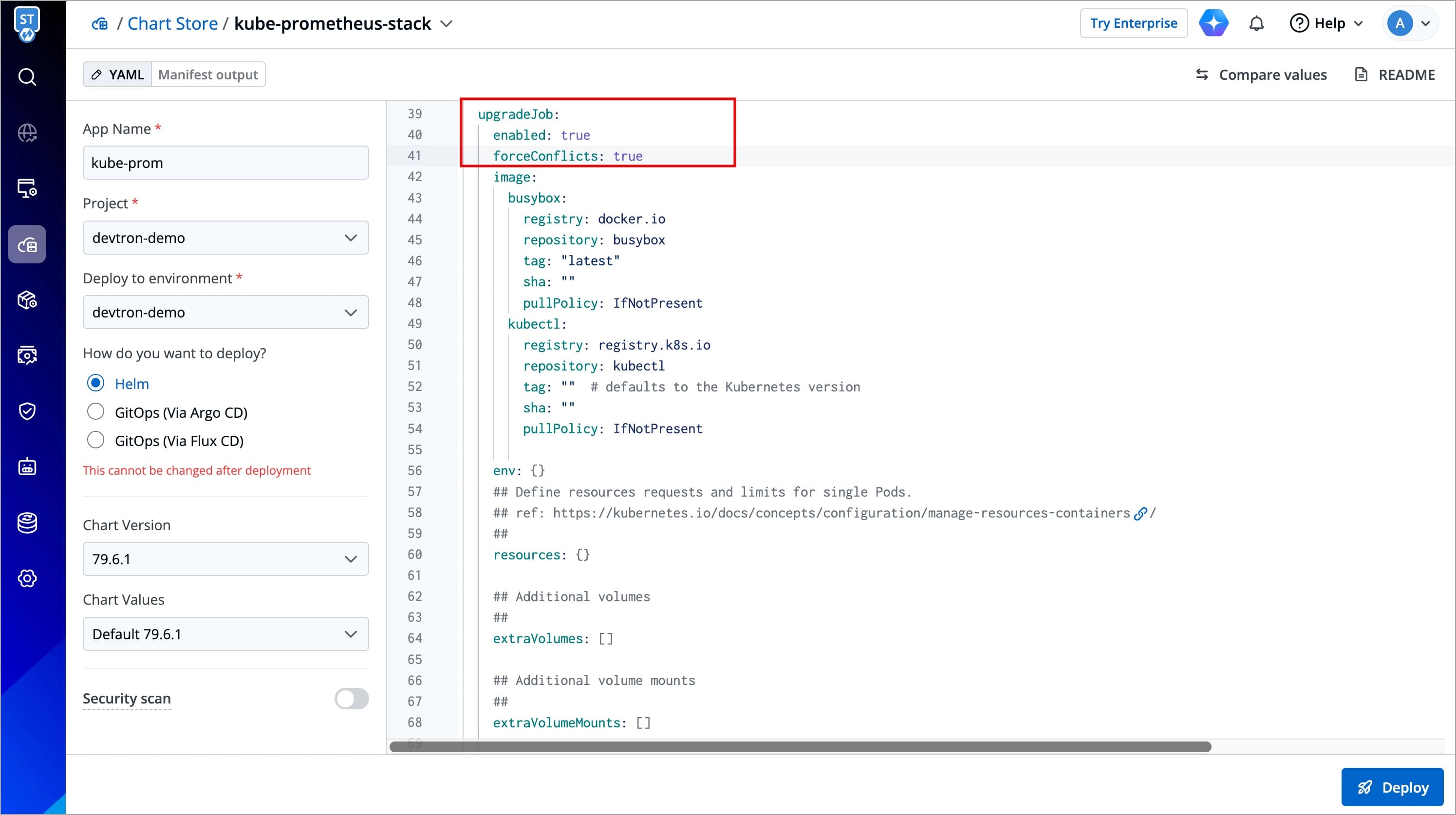 upgradeJobparameter in the Helm chart to ensure CRDs are applied before deploying Prometheus.In the Prometheus Helm chart settings, locate the