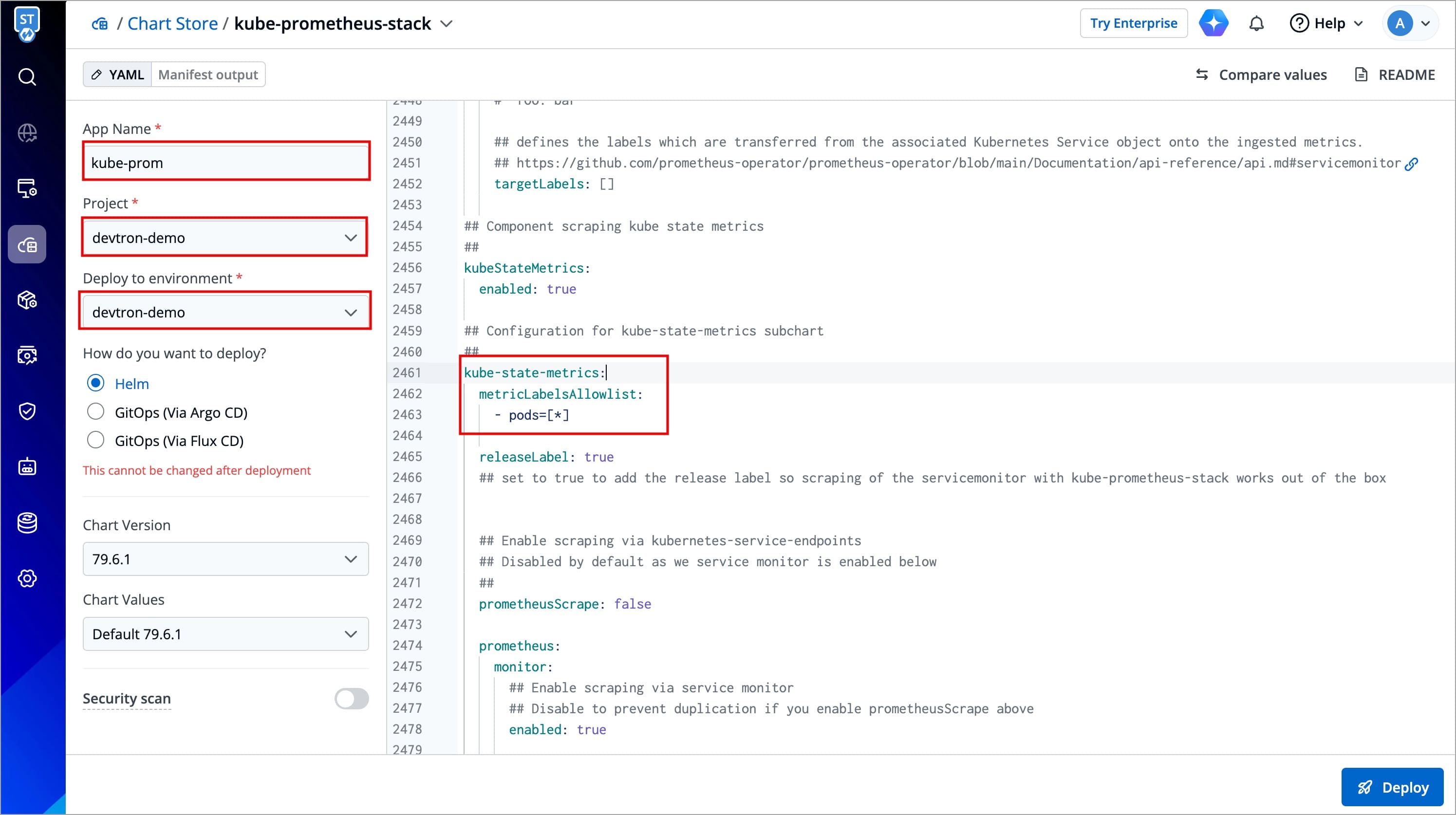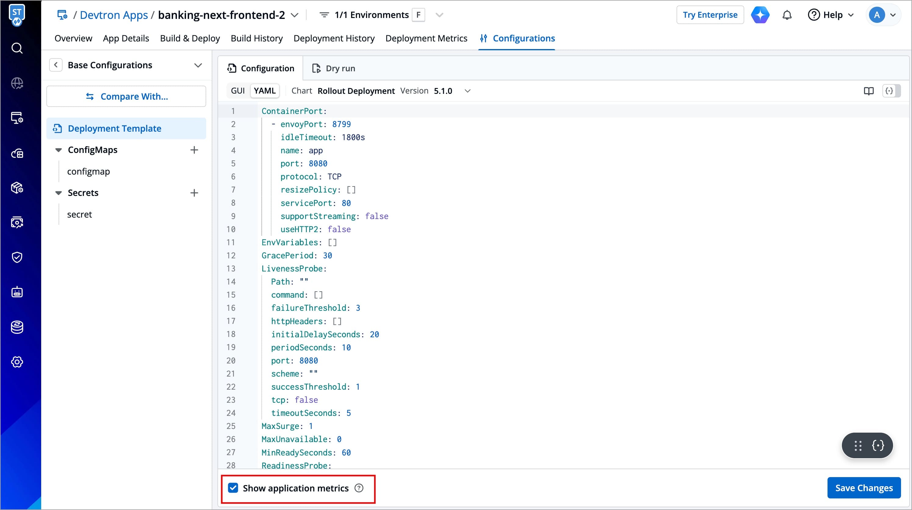 Enable Application Metrics in the Deployment Template as shown below and save the changes.