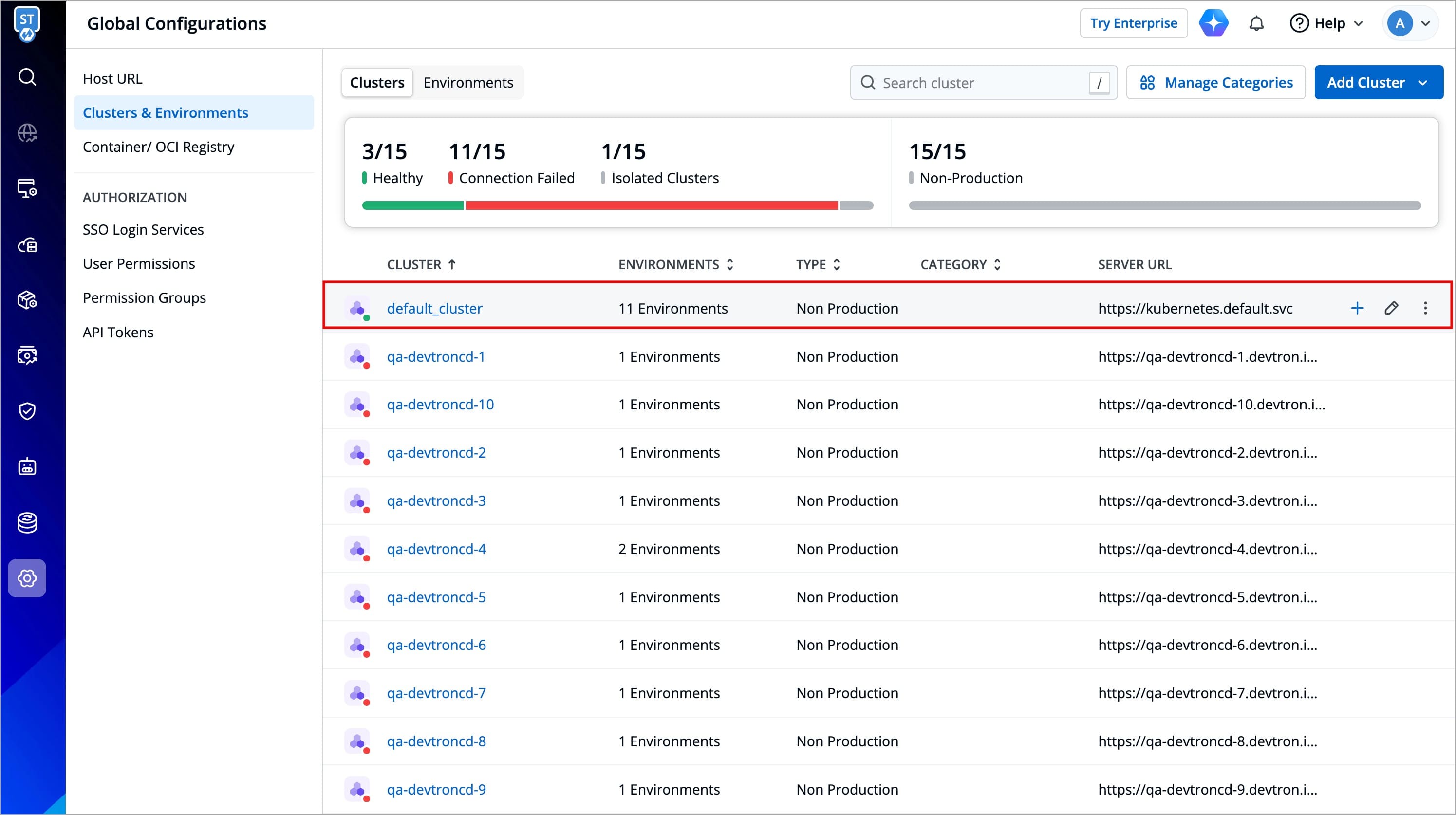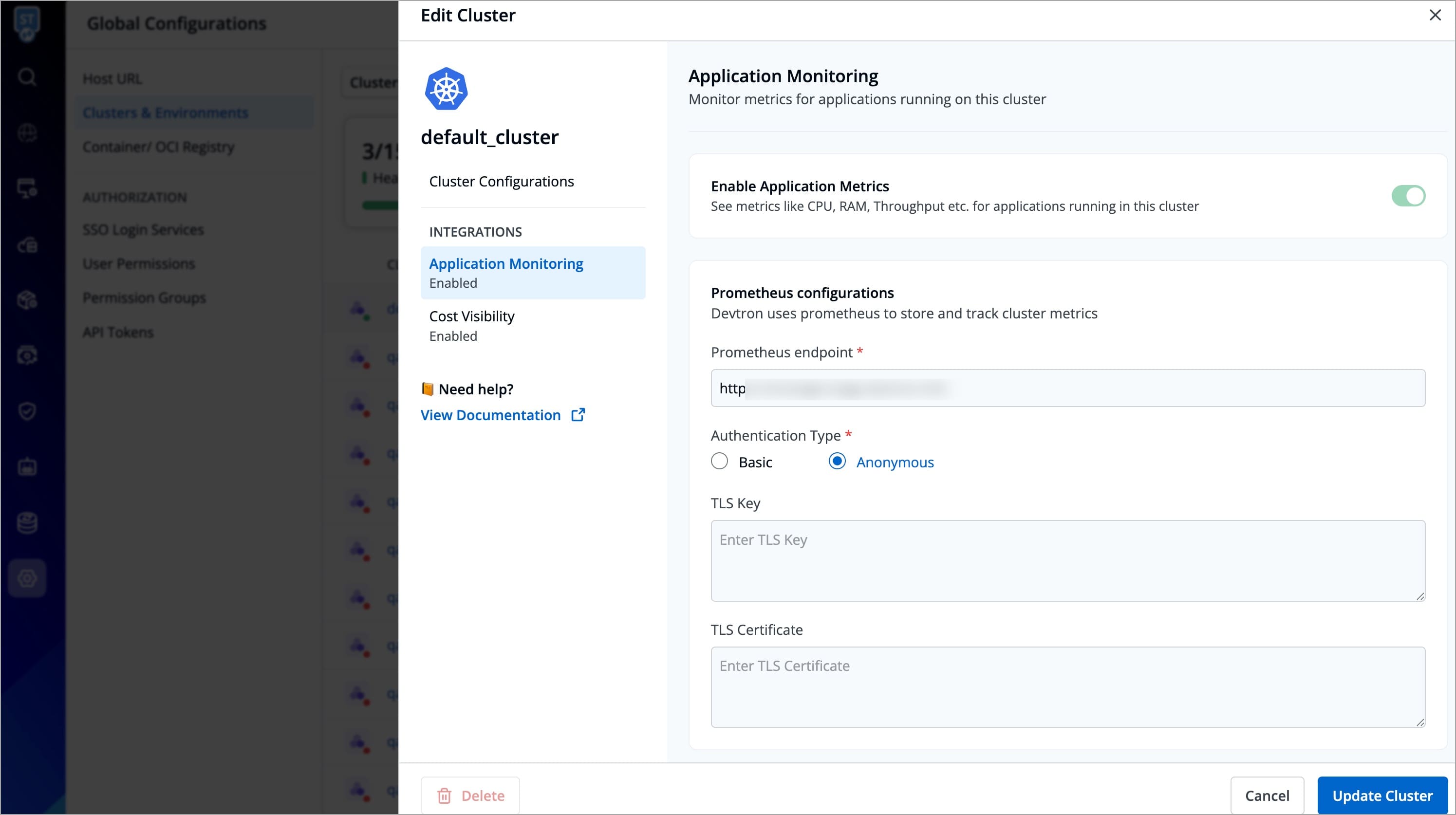 If the graphs are not visible check if Prometheus is configured properly. Then go to Global Configurations → Clusters & Environments → Click on any environment for the cluster where you added Prometheus endpoint and simply click Update.