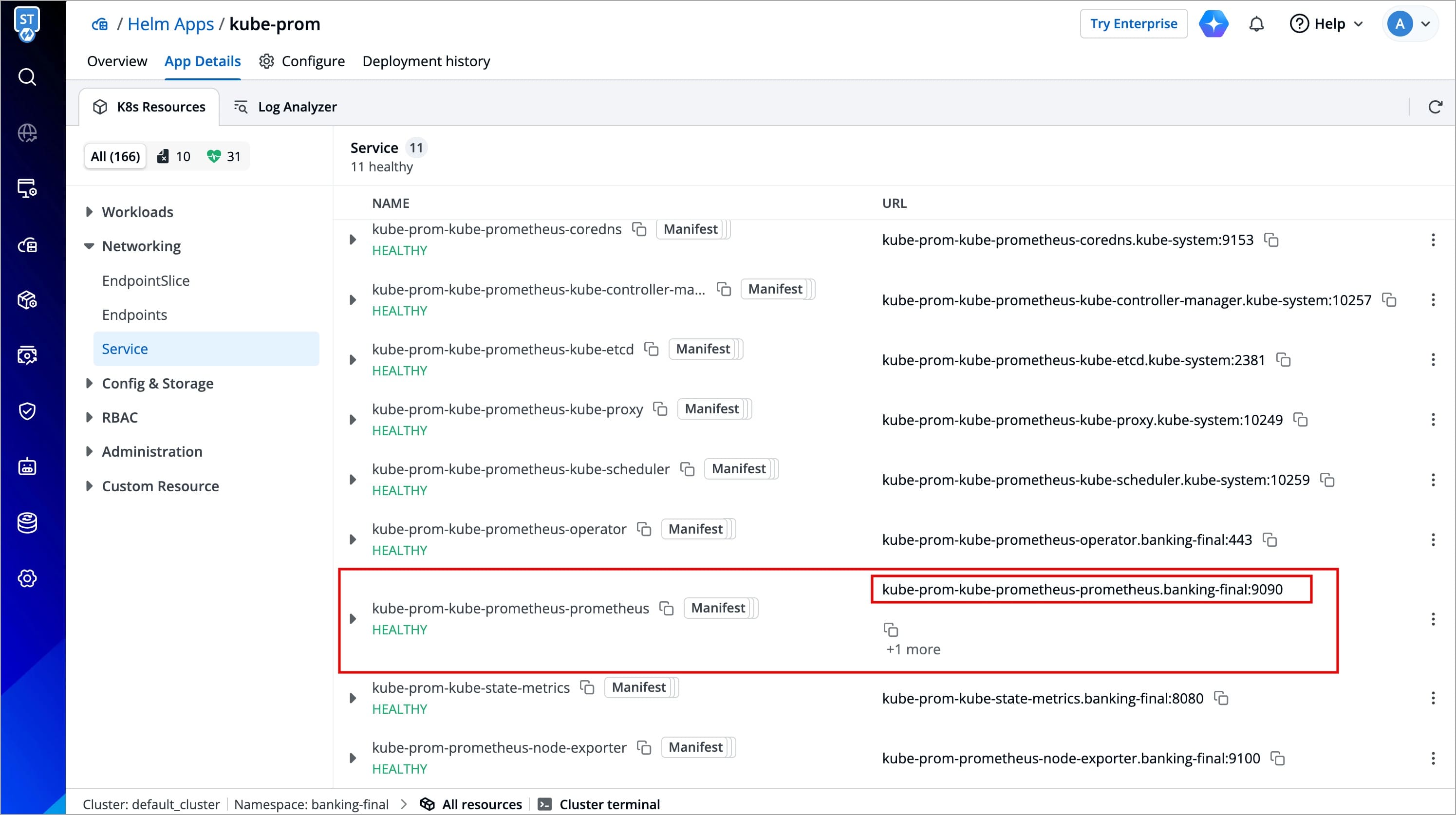 Once Prometheus is installed, go to its App Details and navigate to Networking → Service in the K8s resources. Expand the Prometheus server service to see the endpoints.