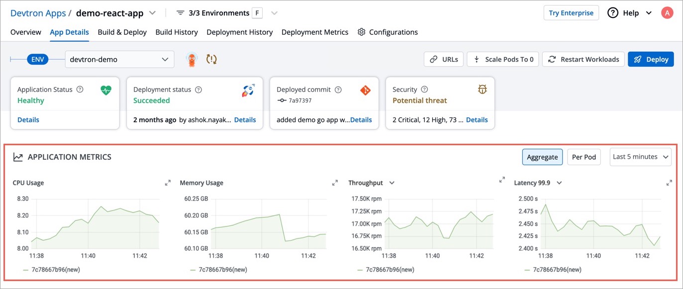 If you want to see application metrics like different HTTP status codes metrics, application throughput, latency, response time. Enable the Application metrics from below the deployment template Save button. After enabling it, you should be able to see all metrics on App detail page. By default it remains disabled.